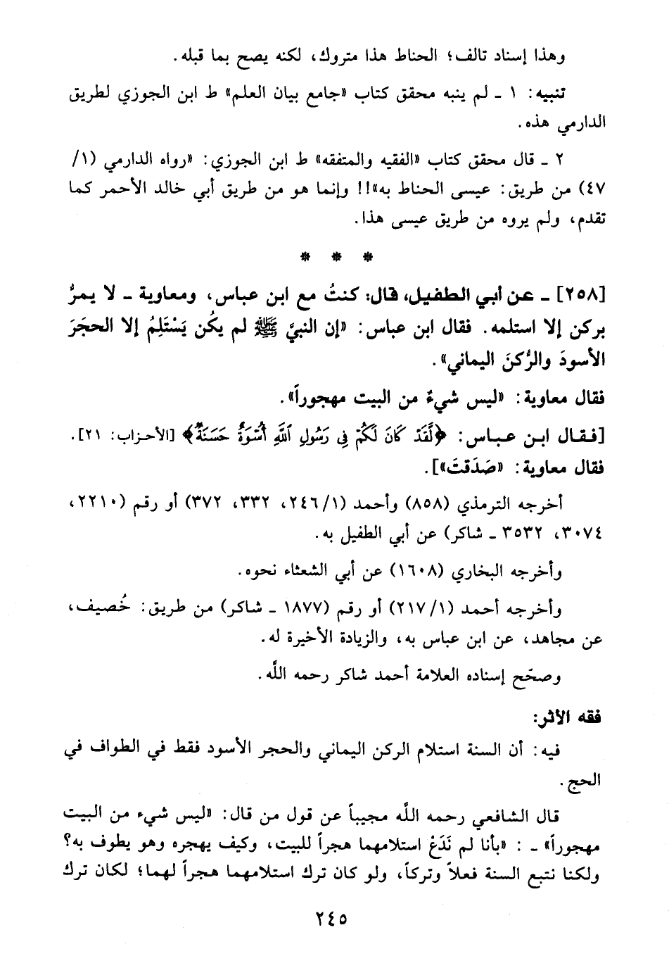 258 - عن أبي الطفيل، قال: كنتُ مع ابن عباس، ومعاوية - لا يمرُّ بركن إلا استلمه. فقال ابن عباس: "إن النبيَّ -صلى الله عليه وسلم - لم يكُن يَسْتَلِمُ إلا الحجَرَ الأسودَ والرُّكنَ اليماني".