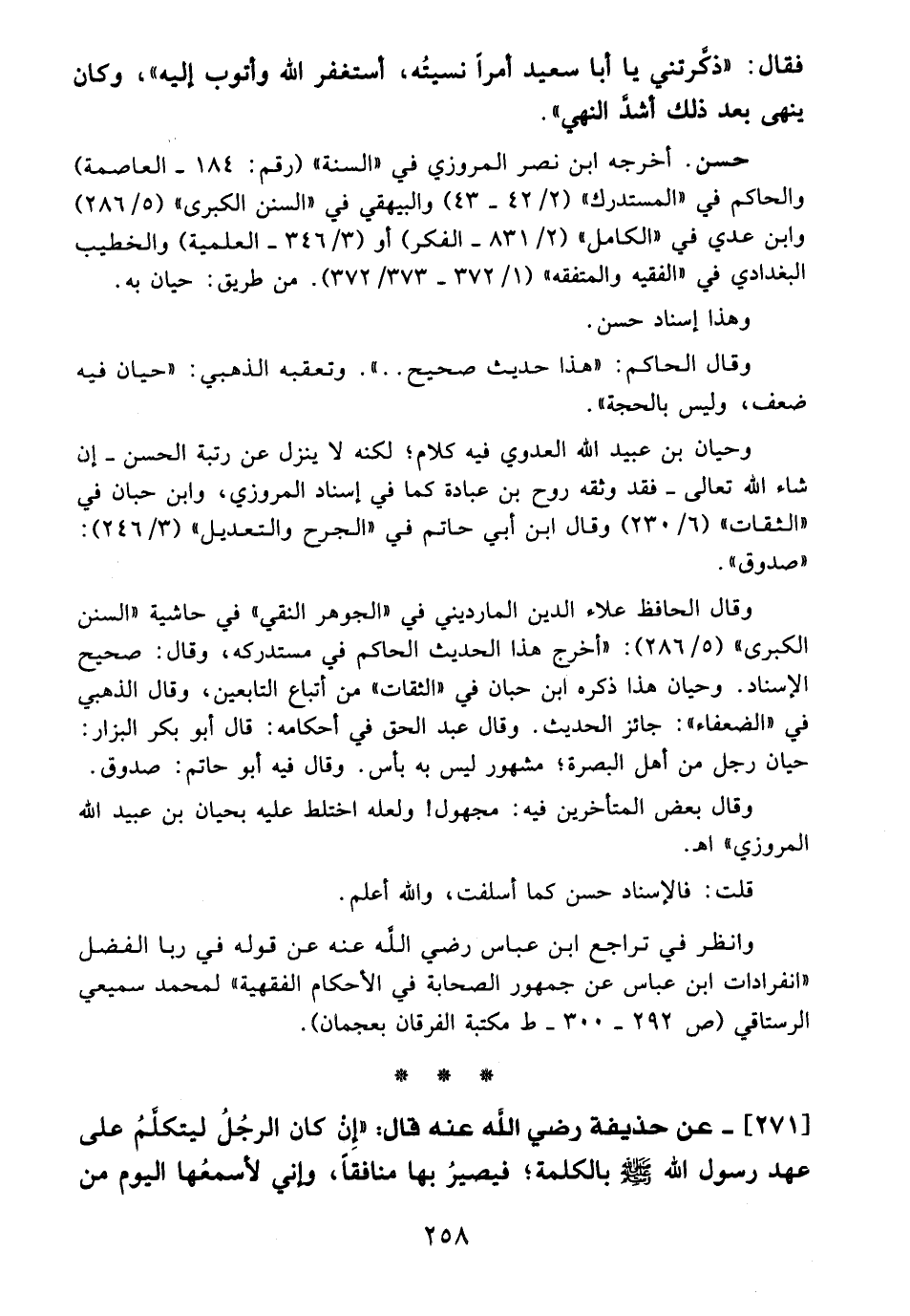 حسن. أخرجه ابن نصر المروزي في "السنة" (رقم: 184 - العاصمة) والحاكم في "المستدرك" (2/ 42 - 43) والبيهقي في "السنن الكبرى" (5/ 286) وابن عدي في "الكامل" (2/ 831 - الفكر) أو (3/ 346 - العلمية) والخطيب البغدادي في "الفقيه والمتفقه" (1/ 372 - 373/ 372). من طريق: حيان به.