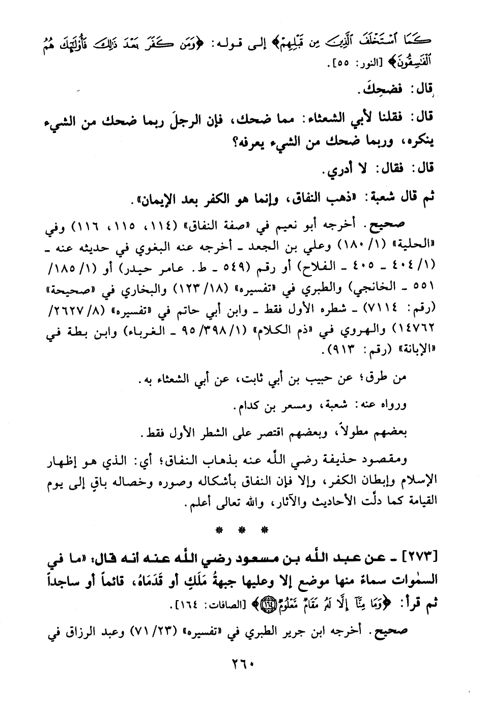 273 - عن عبد الله بن مسعود - رضي الله عنه - أنه قال:"ما في السموات سماءٌ منها موضع إلا وعليها جبهةُ مَلَكٍ أو قَدَمَاهُ، قائماً أو ساجداً ثم قرأ: {وَمَا مِنَّا إِلَّا لَهُ مَقَامٌ مَعْلُومٌ (164)} [الصافات: 164].
