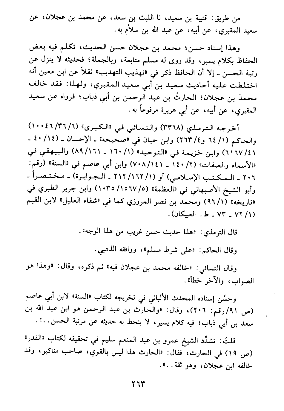 قلتُ: تشدَّد الشيخ عمرو بن عبد المنعم سليم في تحقيقه لكتاب "القدر" (ص 19) في الحارث، فقال: "الحارث هذا ليس بالقوي، صاحب مناكير، وقد خالفه ابن عجلان، وهو ثقة .. ".