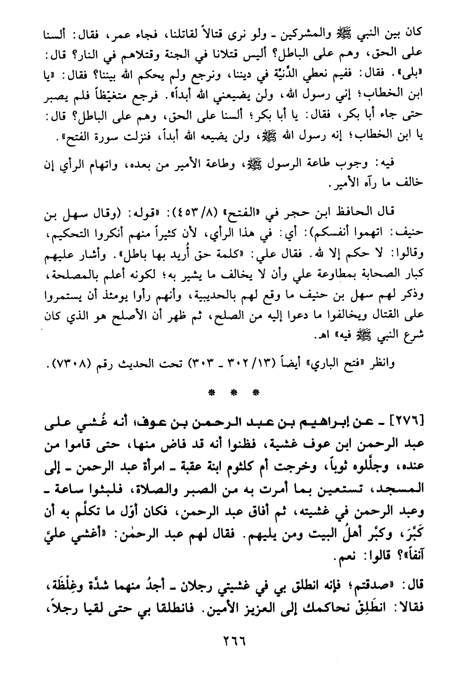 276 - عن إبراهيم بن عبد الرحمن بن عوف، أنه غُشى على عبد الرحمن ابن عوف غشية، فظنوا أنه قد فاض منها، حتى قاموا من عنده، وجلَّلوه ثوباً، وخرجت أم كلثوم ابنة عقبة -امرأة عبد الرحمن-إلى المسجد، نستعين بما أمرت به من الصبر والصلاة، فلبثوا ساعة - وعبد الرحمن في غشيته، ثم أفاق عبد الرحمن، فكان أوّل ما تكلَّم به أن كَبَّرَ، وكبَّر أهلُ الببت ومن يليهم. فقال لهم عبد الرحمن: "أغشي عليَّ آنفاً"؟ قالوا: نعم.