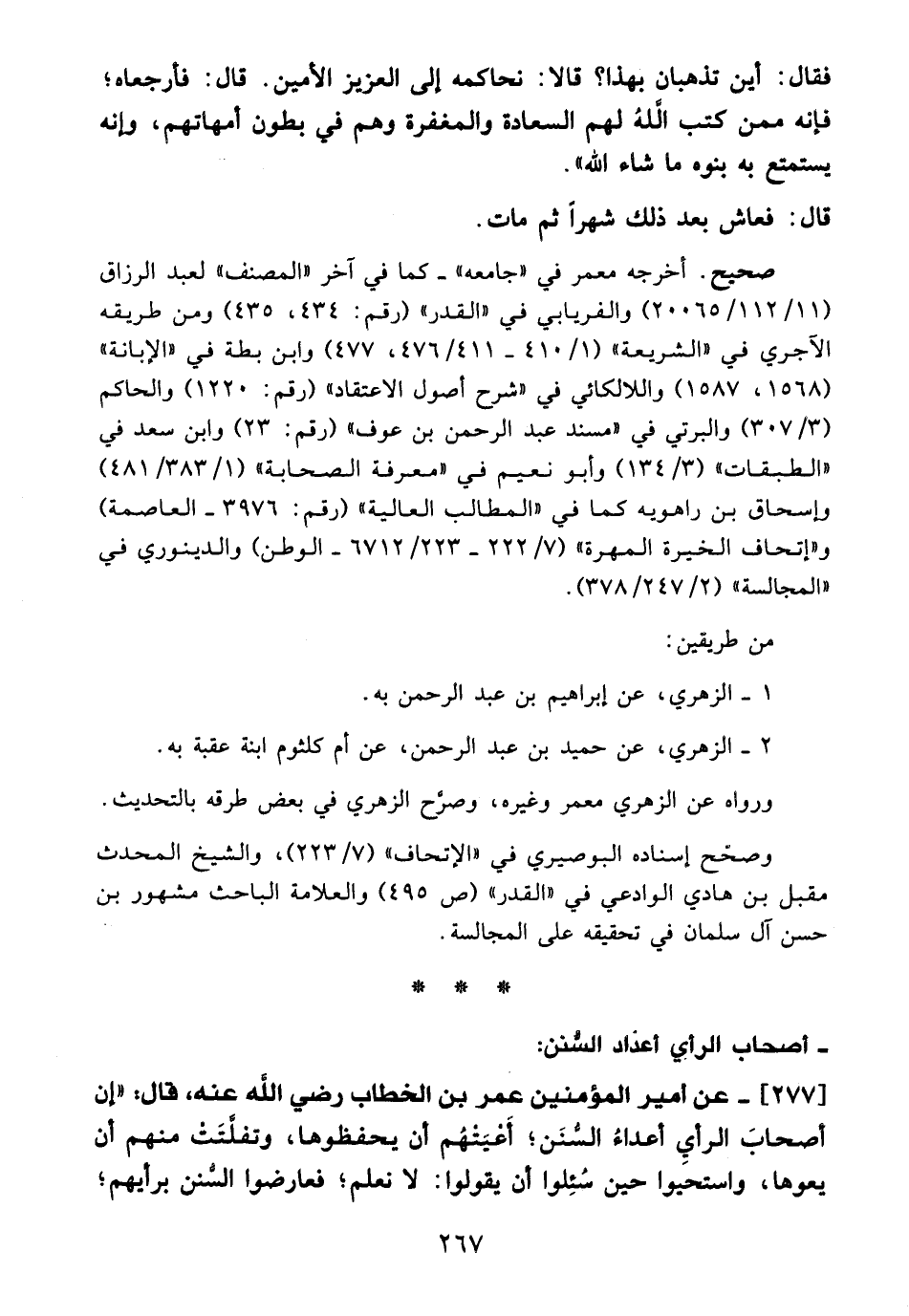 277 - عن أمير المؤمنين عمر بن الخطاب - رضي الله عنه -، قال: "إن أصحابَ الرأي أعداءُ السُّنَن؛ أَعْيَتْهُم أن يحفظوها، وتفلَّتَتْ منهم أن يعوها، واستحَيوا حين سُئِلوا أن يقولوا: لا نعلم؛ فعارضوا السُّنن برأيهم؛
