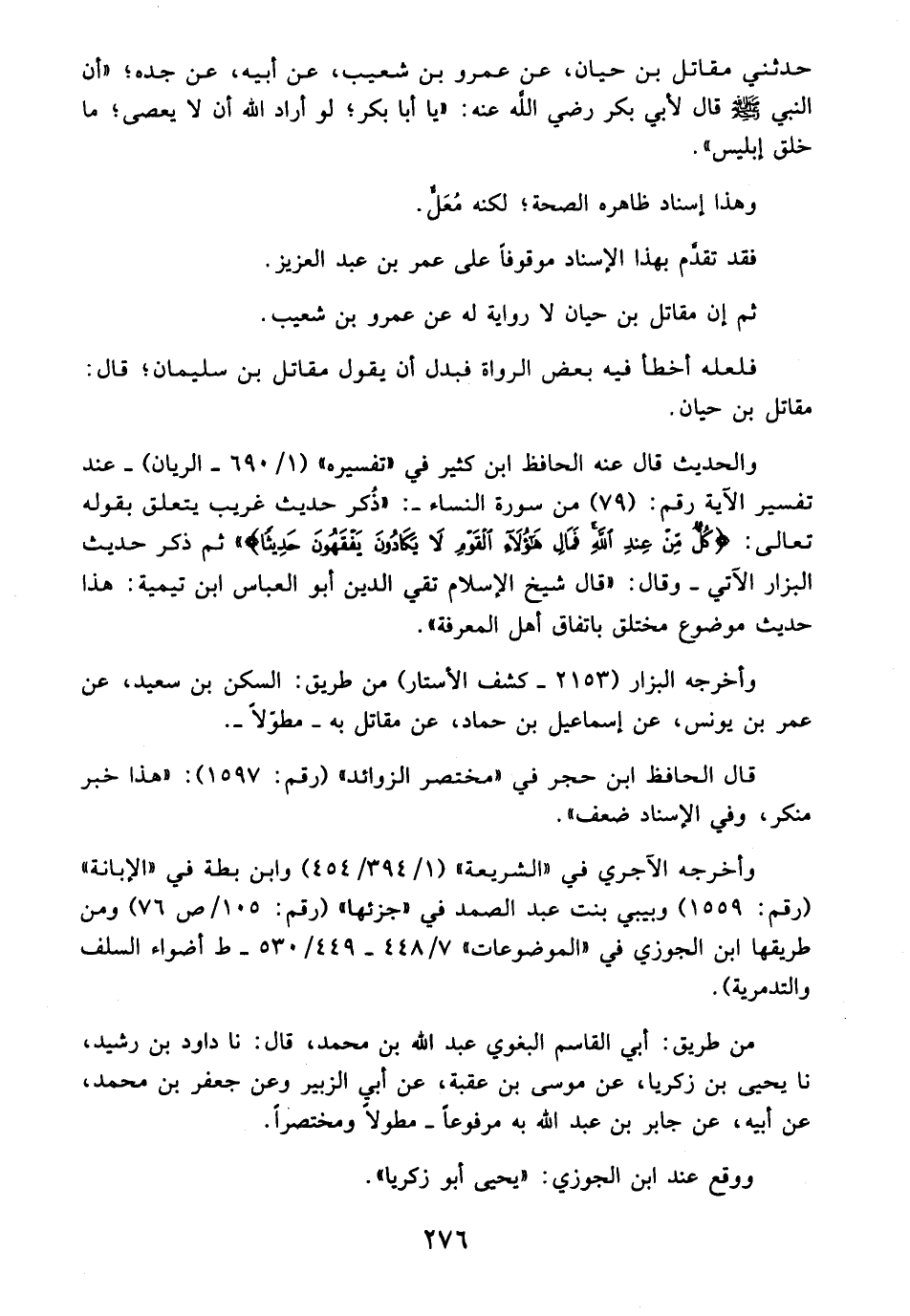 حدثني مقاتل بن حيان، عن عمرو بن شعيب، عن أبيه، عن جده؛ "أن النبي - صلى الله عليه وسلم - قال لأبي بكر - رضي الله عنه -: "يا أبا بكر؛ لو أراد الله أن لا يعصى؛ ما خلق إبليس".