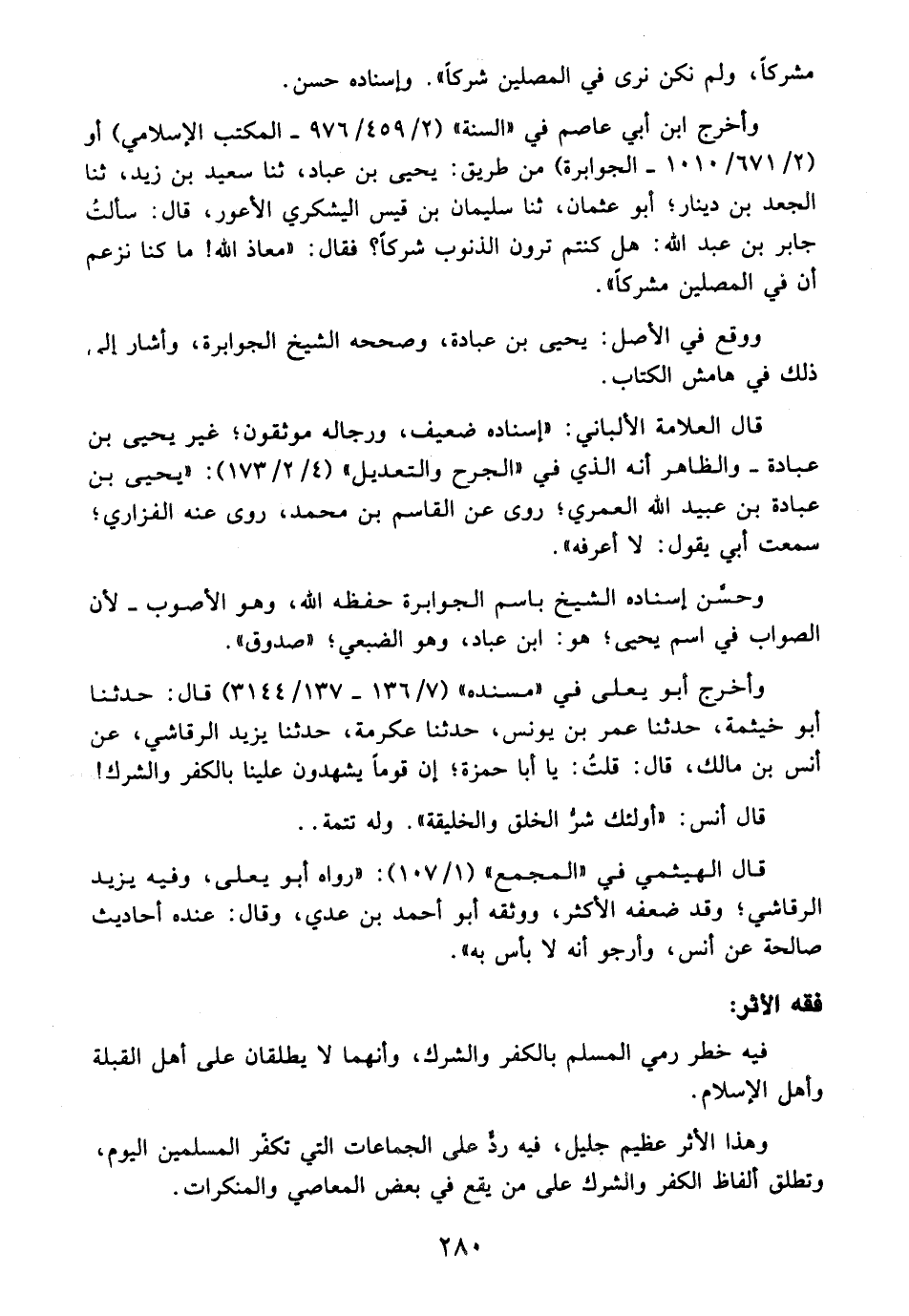 وأخرج ابن أبي عاصم في "السنة" (2/ 459/ 976 - المكتب الإسلامى) أو (2/ 671/ 1010 - الجوابرة) من طريق: يحيى بن عباد، ثنا سعيد بن زيد، ثنا الجعد بن دينار؛ أبو عثمان، ثنا سليمان بن قيس اليشكري الأعور، قال: سألتُ جابر بن عبد الله: هل كنتم ترون الذنوب شركاً؟ فقال: "معاذ الله! ما كنا نزعم أن في المصلين مشركاً".