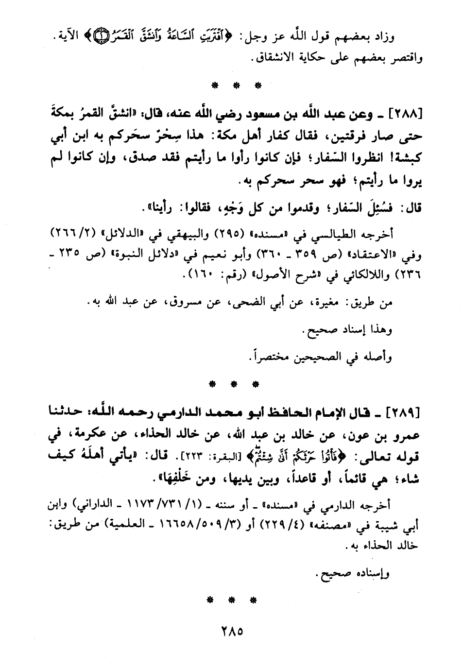 288 - وعن عبد الله بن مسعود - رضي الله عنه -، قال: "انشقَّ القمرُ بمكةَ حتى صار فرقتين، فقال كفار أهل مكة: هدا سِحْرٌ سحَركم به ابن أبي كبشة! انظروا السّفار؛ فإن كانوا رأوا ما رأيتم فقد صدق، وإن كانوا لم يروا ما رأيتم؛ فهو سحر سحركم به.