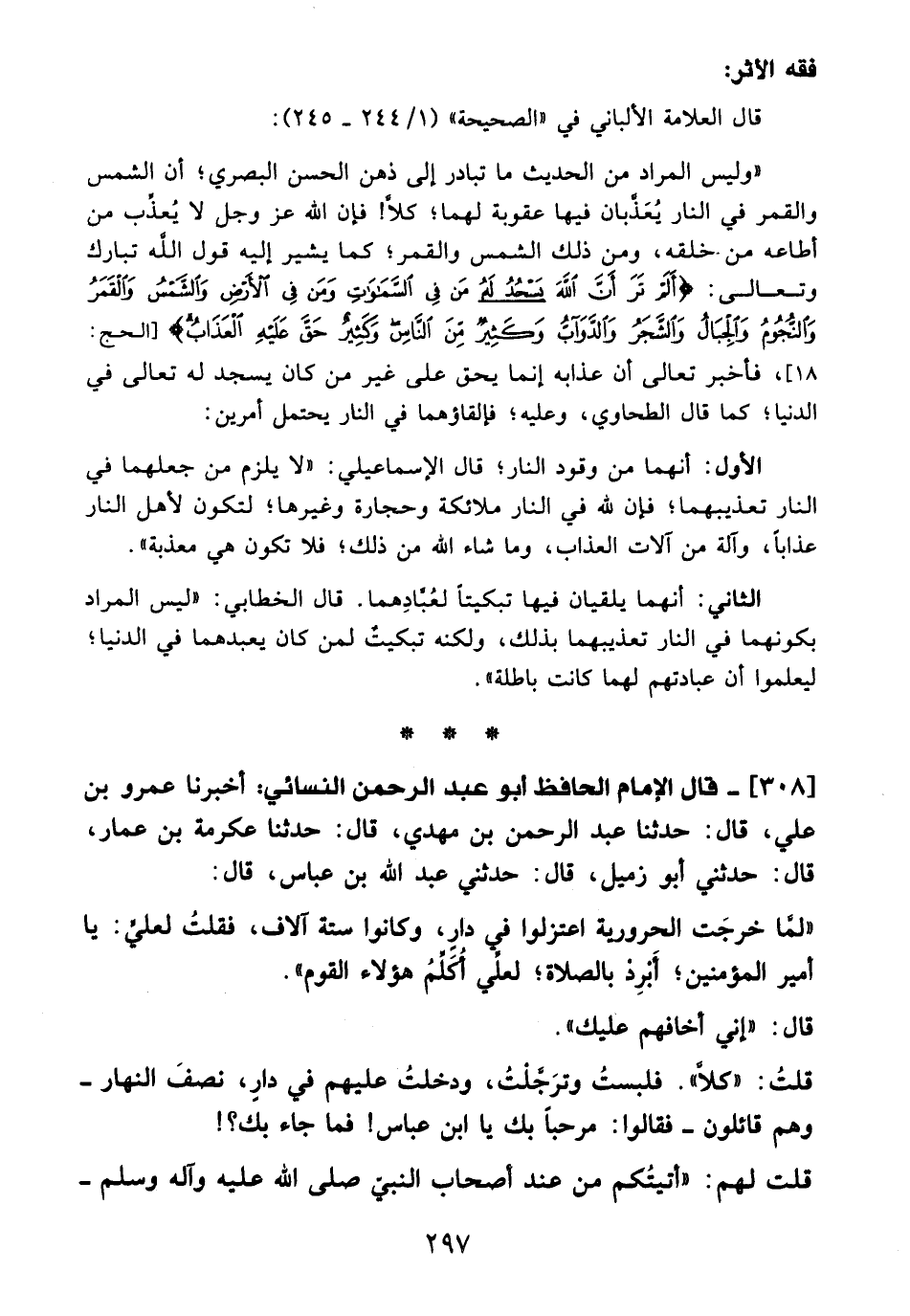 "وليس المراد من الحديث ما تبادر إلى ذهن الحسن البصري؛ أن الشمس والقمر في النار يُعَذَّبان ميها عقوبة لهما؛ كلَّا! فإن الله -عَزَّ وَجَلَّ- لا يُعذِّب من أطاعه من. خلقه، ومن ذلك الشمس والقمر؛ كما يشير إليه قول الله تبارك وتعالى: {أَلَمْ تَرَ أَنَّ اللهَ يَسْجُدُ لَهُ مَنْ فِي السَّمَاوَاتِ وَمَنْ فِي الْأَرْضِ وَالشَّمْسُ وَالْقَمَرُ وَالنُّجُومُ وَالْجِبَالُ وَالشَّجَرُ وَالدَّوَابُّ وَكَثِيرٌ مِنَ النَّاسِ وَكَثِيرٌ حَقَّ عَلَيْهِ الْعَذَابُ} [الحج: 18]، فأخبر تعالى أن عذابه إنما يحق على غير من كان يسجد له تعالى في الدنيا؛ كلما قال الطحاوي، وعليه؛ فإلقاؤهما في النار يحتمل أمرين: