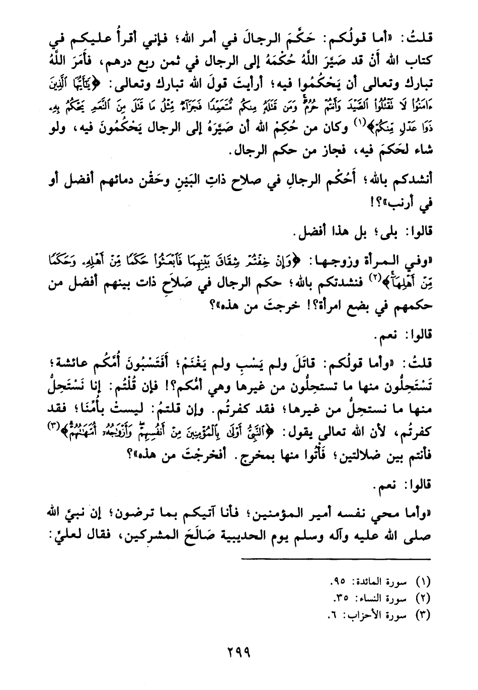 قلتُ: "أما قولُكم: حَكمَ الرجالَ في أمر الله؛ فإني أقرأُ عليكم في كتاب الله أَنْ قد صَيَّرَ اللهُ حُكمَهُ إلى الرجال في ثمن ربع درهم، فأَمَرَ اللهُ تبارك وتعالى أن يَحْكُمُوا فيه؛ أرأيتَ قولَ الله تبارك وتعالى: {يَاأَيُّهَا الَّذِينَ آمَنُوا لَا تَقْتُلُوا الصَّيْدَ وَأَنْتُمْ حُرُمٌ وَمَنْ قَتَلَهُ مِنْكُمْ مُتَعَمِّدًا فَجَزَاءٌ مِثْلُ مَا قَتَلَ مِنَ النَّعَمِ يَحْكُمُ بِهِ ذَوَا عَدْلٍ مِنْكُمْ} (¬1) وكان من حُكِمْ الله أن صَيَّرَهُ إلى الرجال يَحْكُمُونَ فيه، ولو شاء لحَكمَ فيه، فجاز من حكم الرجال.