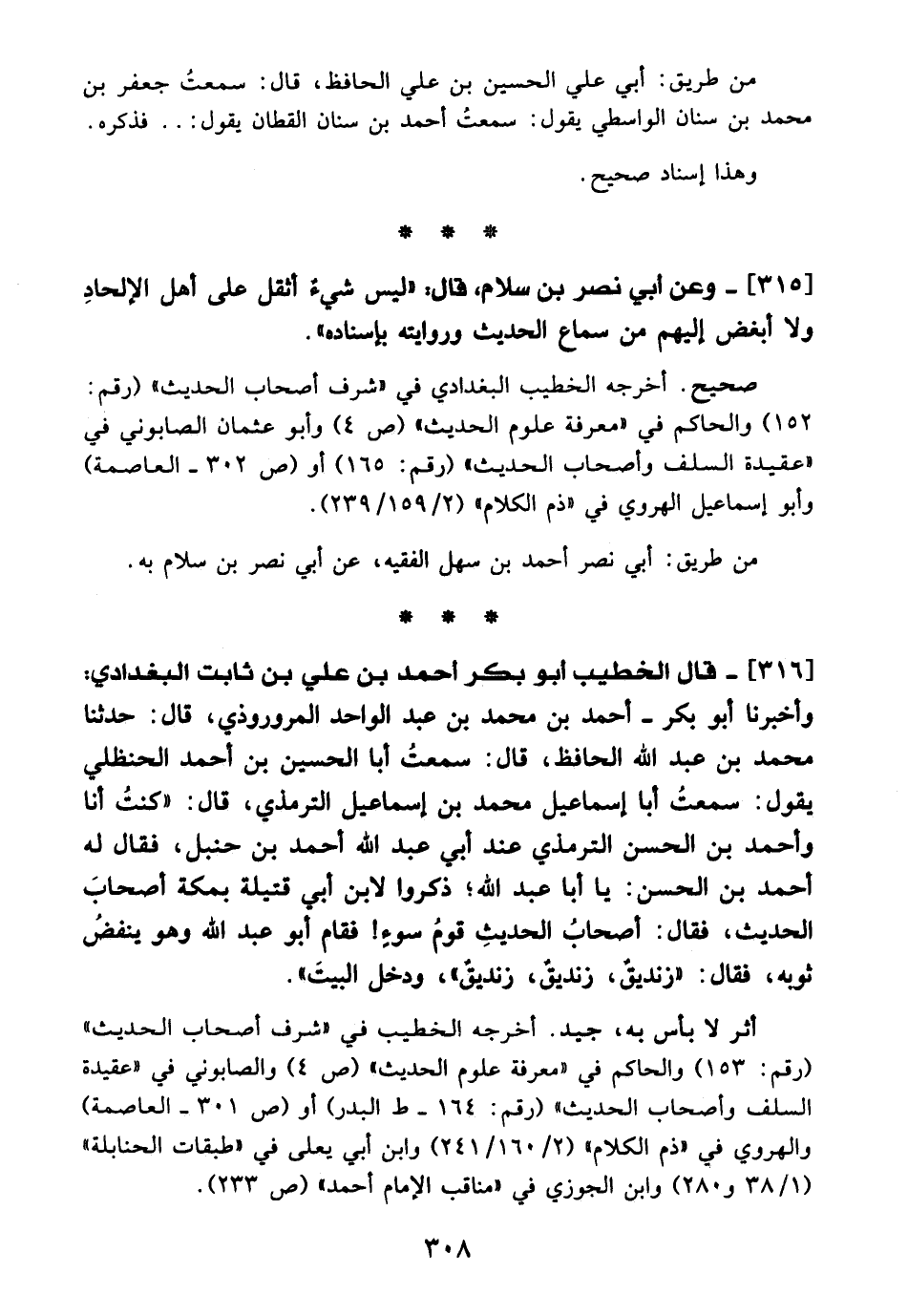315 - وعن أبي نصر بن سلام، قال: "ليس شيءٌ أثقل على أهل الإلحادِ ولا أبغض إليهم من سماع الحدبث وروايته بإسناده".