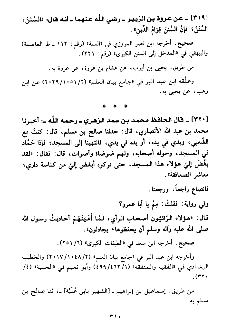 319 - عن عروة بن الزبير- رضي الله عنهما - أنه قال: "السُّنَنُ، السُّنَنُ؛ فإن السُّنَنَ قِوَامُ الدِّينِ".
