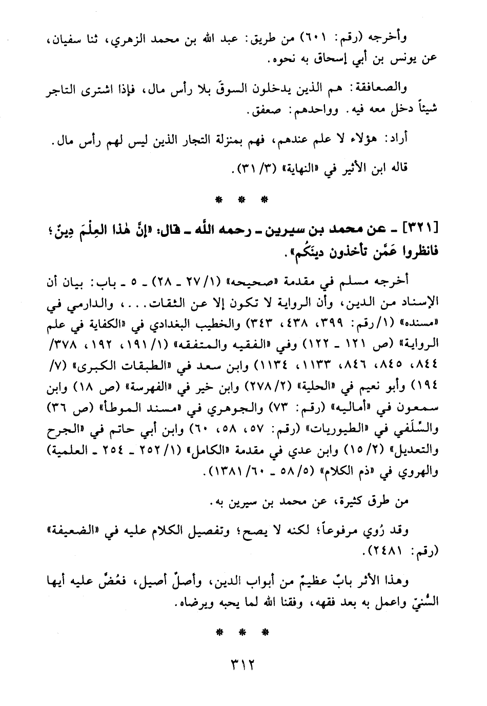 321 - عن محمد بن سيرين -رَحِمَهُ اللهُ- قال: "إنَّ هذا العِلْمَ دِينٌ؛ فانظروا عَمَّن تأخذون دينَكُم".