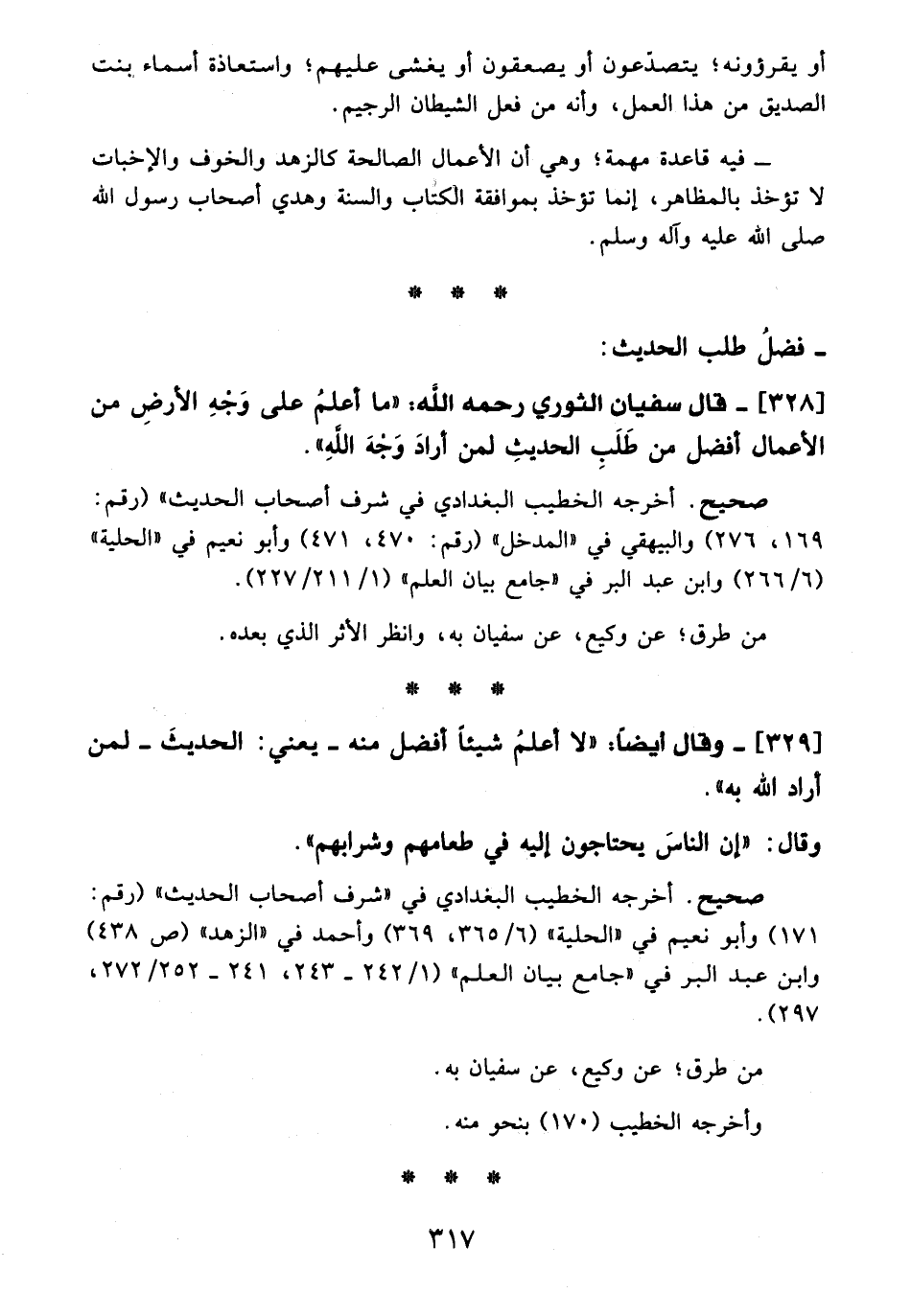 328 - قال سفيان الثوري -رَحِمَهُ اللهُ-: "ما أعلمُ على وَجْهِ الأرضِ من الأعمال أفضل من طَلَبِ الحديثِ لمن أرادَ وَجْهَ اللهِ".