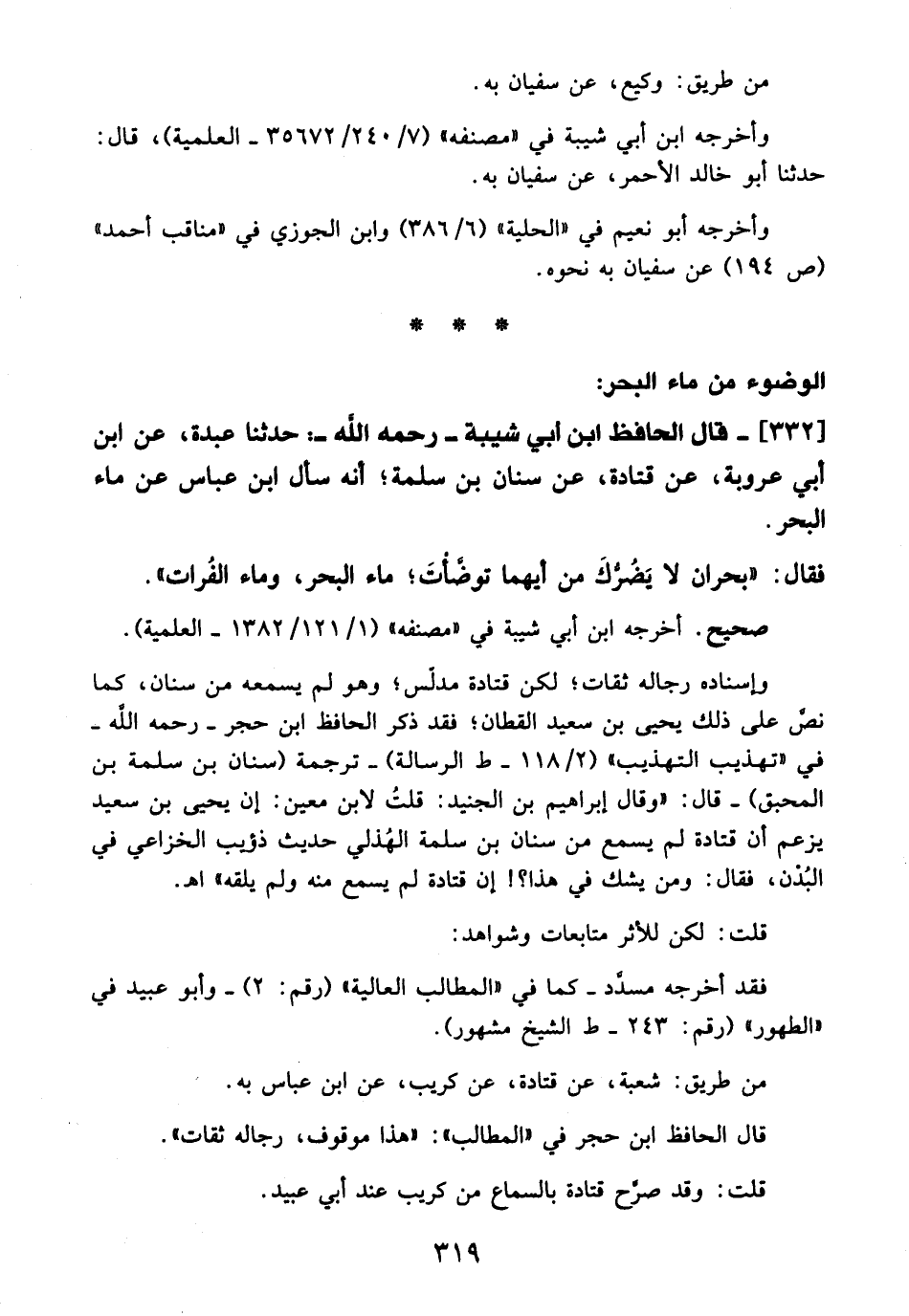 332 - قال الحافظ ابن أبي شيبة -رَحِمَهُ اللهُ-: حدثنا عبدة، عن ابن أبي عروبة، عن قتادة، عن سنان بن سلمة؛ أنه سأل ابن عباس عن ماء البحر.