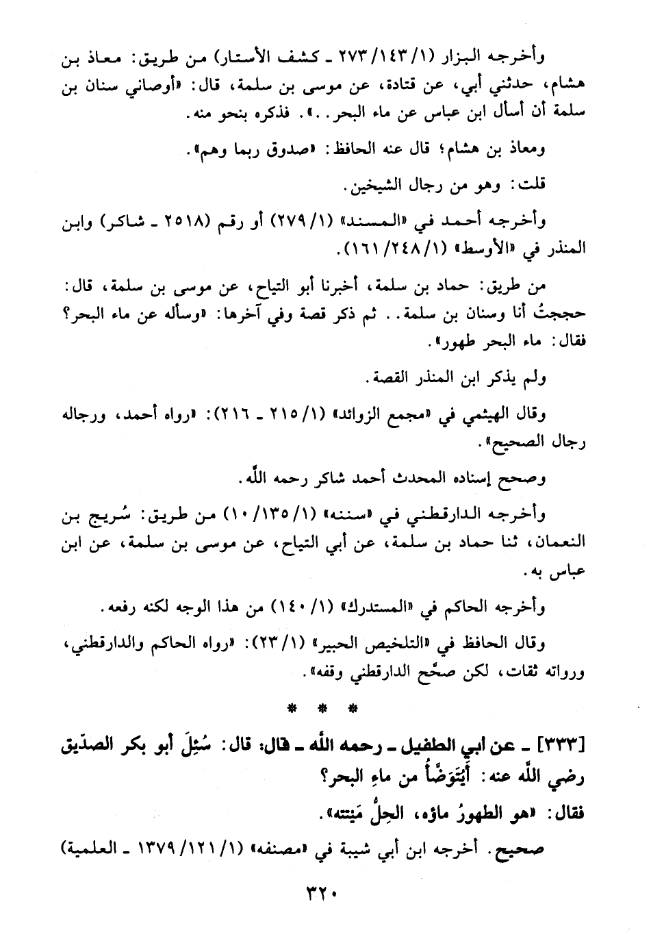 333 - عن أبي الطفيل -رَحِمَهُ اللهُ- قال: قال: سُئِلَ أبو بكر الصدّيق - رضي الله عنه -: أَيُتَوَضَّأُ من ماءِ البحر؟