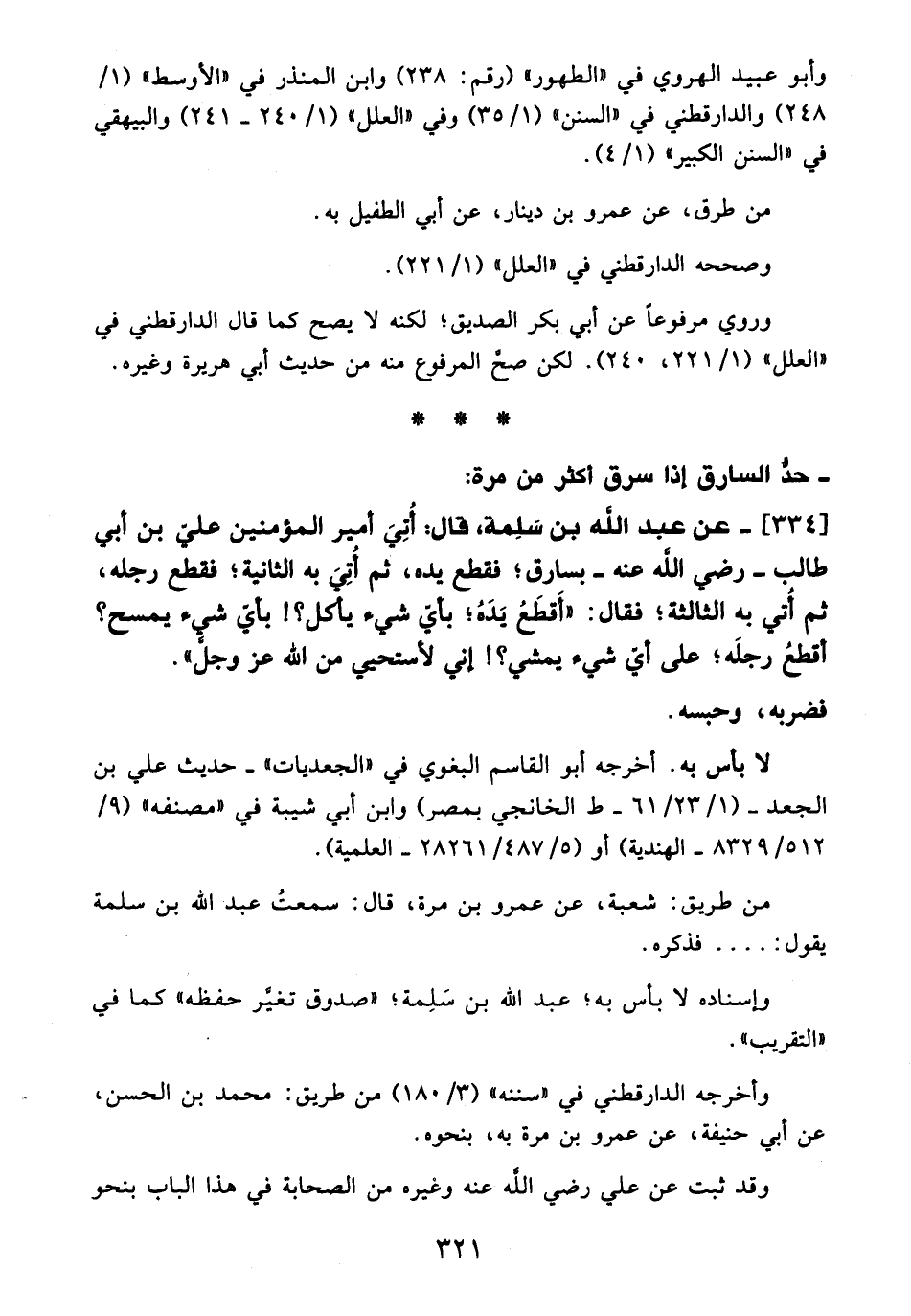 334 - عن عبد الله بن سَلِمة، قال: أُتِيَ أمير المؤمنين عليّ بن أبي طالب - رضي الله عنه - بسارق؛ فقطع يده، ثم أُتِيَ به الثانية؛ فقطع رجله، ثم أُتي به الثالثة؛ فقال: "أَقطَعُ يَدَهُ؛ بأيّ شيء يأكل؟! بأيّ شيء يمسح؟ أقطعُ رجلَه؛ على أيّ شيء يمشي؟! إني لأستحيي من الله -عَزَّ وَجَلَّ-.