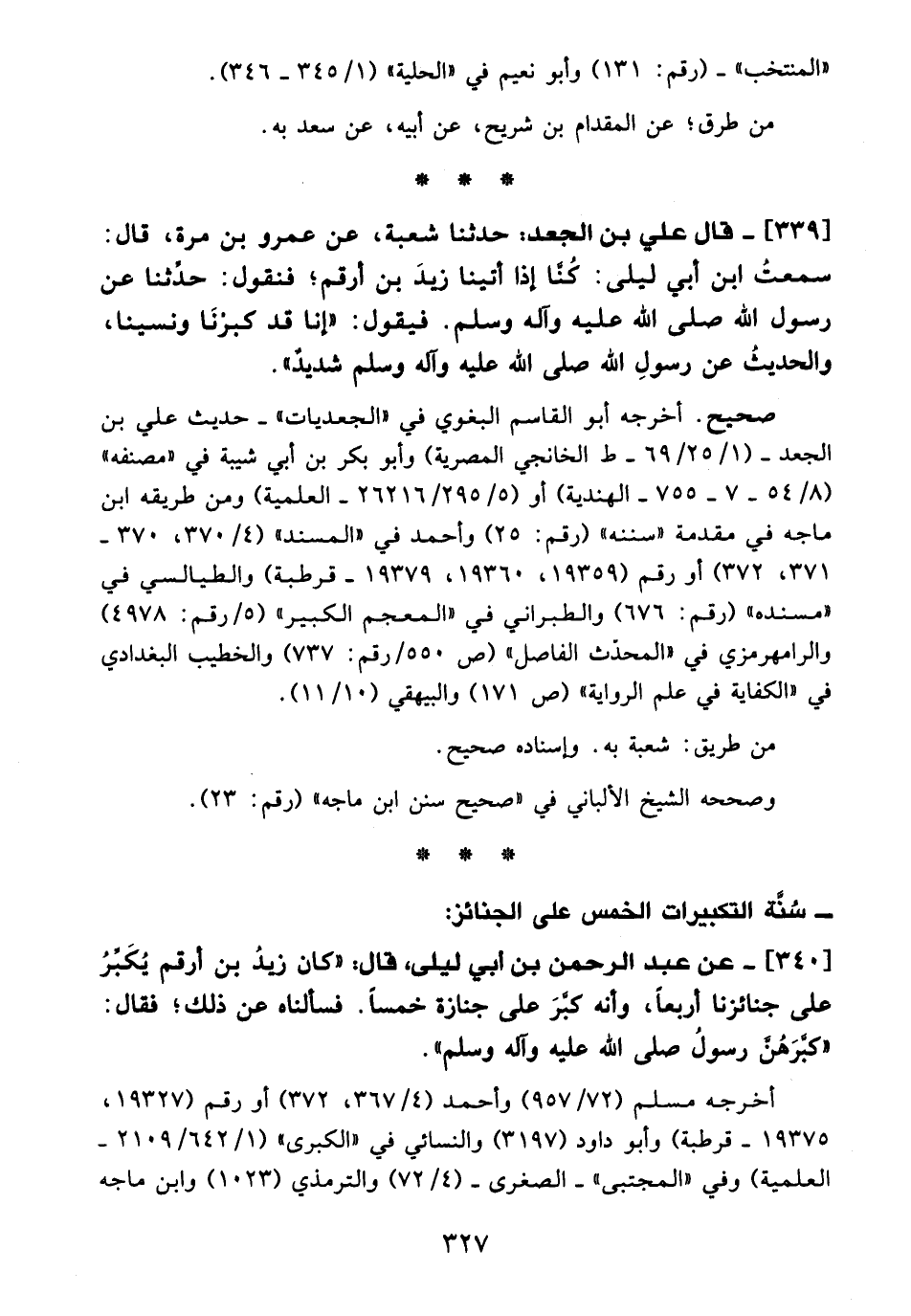 340 - عن عبد الرحمن بن ابي ليلى، قال: "كان زيدُ بن أرقم يُكَبِّرُ على جنائزنا أربعًا، وأنه كبَّرَ على جنازة خمسًا. فسألناه عن ذلك؛ فقال: "كبَّرَهُن رسولُ - صلى الله عليه وآله وسلم -".