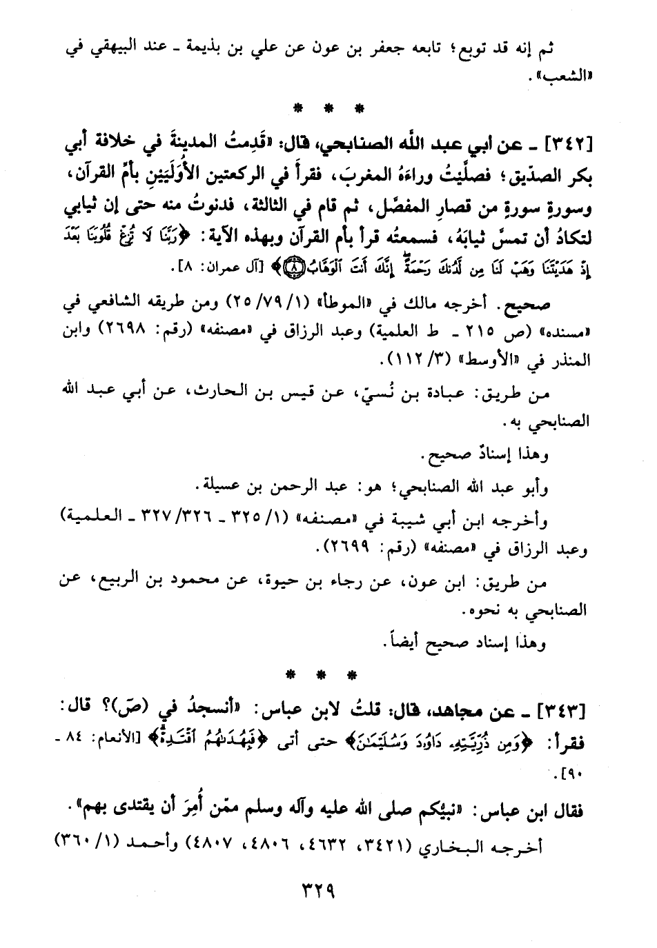 342 - عن أبي عبد الله الصنابحي، قال: "قَدِمتُ المدينةَ في خلافة أبي بكر الصدّيق؛ فصلَّيتُ وراءَهُ المغربَ، فقرأَ في الركعتين الأُوَلَيَيْنِ بأمِّ القرآن، وسورةِ سورةِ من قصارِ المفضَّل، ثم قام في الثالثة، فدنوتُ منه حتى إن ثيابي لتكادُ أن تمسَّ ثيابَهُ، فسمعتُه قرأ بأم القرآن وبهده الآية: {رَبَّنَا لَا تُزِغْ قُلُوبَنَا بَعْدَ إِذْ هَدَيْتَنَا وَهَبْ لَنَا مِنْ لَدُنْكَ رَحْمَةً إِنَّكَ أَنْتَ الْوَهَّابُ (8)} [آل عمران: 8].