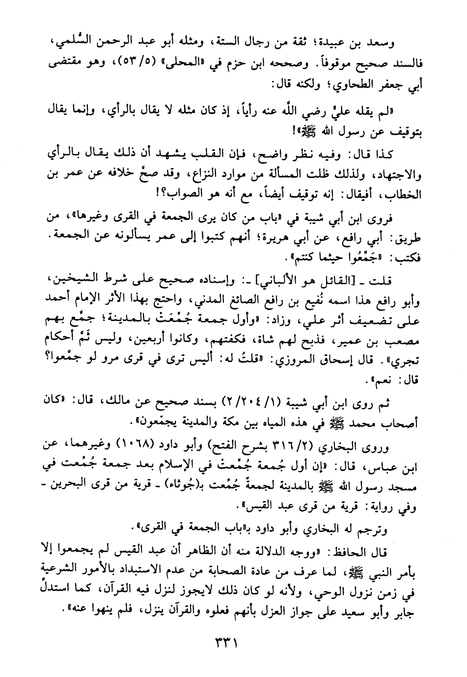 قلت -[القائل هو الألباني]-: وإسناده صحيح على شرط الشيخين، وأبو رافع هذا اسمه نُفيع بن رافع الصائغ المدني، واحتج بهذا الأثر الإمام أحمد على تضعيف أثر علي، وزاد: "وأول جمعة جُمِّعَتْ بالمدينة؛ جمَّع بهم مصعب بن عمير، فذبح لهم شاة، فكفتهم، وكانوا أربعين، وليس ثَمَّ أحكام تجري". قال إسحاق المروزي: "قلتُ له: أليس ترى في قرى مرو لو جمَّعوا؟ قال. نعم".