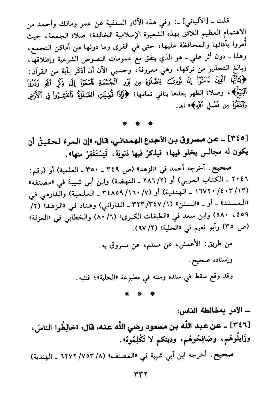 346 - عن عبد الله بن مسعود - رضي الله عنه -، قال: "خالِطُوا الناسَ، وزَايلُوهُم، وصَافِحُوهُم، ودينكم لا تَكْلِمُوهُ".