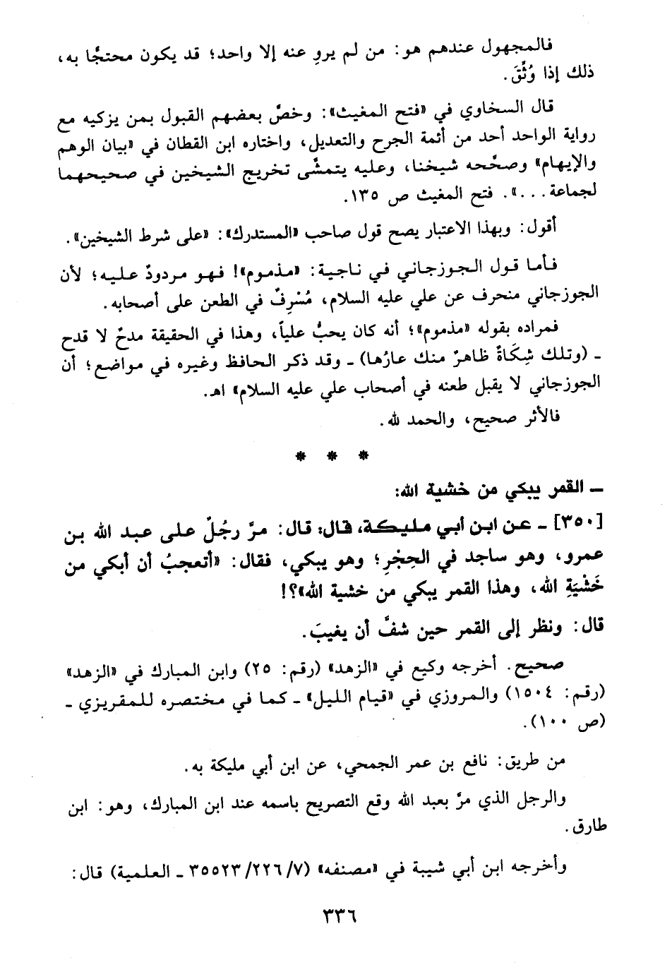 350 - عن ابن أبي مليكة، قال: قال: مرَّ رجُلٌ على عبد الله بن عمرو، وهو ساجد في الحِجْرِ؛ وهو يبكي، فقال: "أتعجبُ أن أبكي من خَشيَةِ الله، وهذا القمر يبكي من خشية الله"؟!