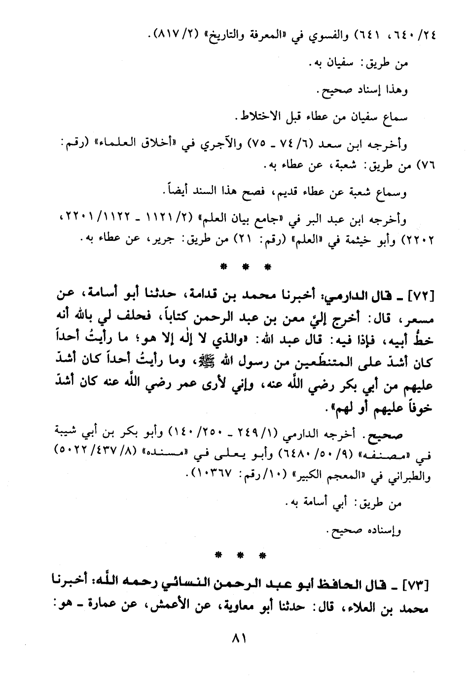 72 - قال الدارمي: أخبرنا محمد بن قدامة، حدثنا أبو أسامة، عن مسعر، قال: أخرج إليَّ معن بن عبد الرحمن كتابًا، فحلف لي بالله أنه خطُّ أبيه، فإذا فيه: قال عبد الله: "والذي لا إله إلا هو؛ ما رأيت أحدًا كان أشدّ على المتنطّعين من رسول الله - صلى الله عليه وسلم -، وما رأيتُ أحدًا كان أشدّ عليهم من أبي بكر - رضي الله عنه -، وإني لأرى عمر - رضي الله عنه - كان أشدّ خوفًا عليهم أو لهم".