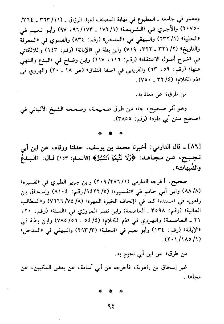 86 - قال الدارمي: أخبرنا محمد بن يوسف، حدثنا ورقاء، عن ابن أبي نجيح، عن مجاهد: {وَلَا تَتَّبِعُوا السُّبُلَ} [الأنعام: 153] قال: "البدعُ والشُّبهات".