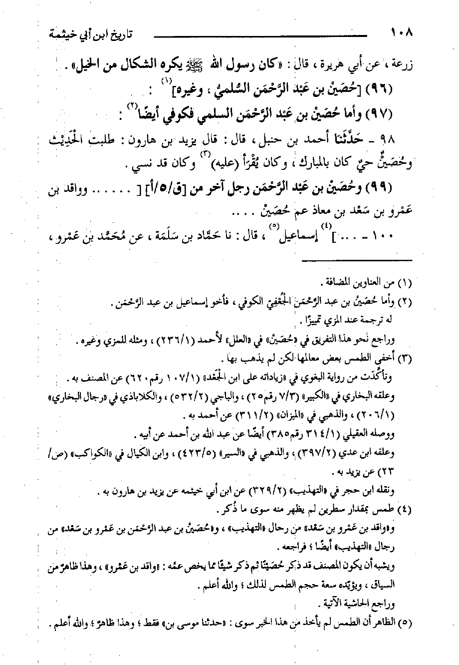 حَدَّثَنَا يَحْيَى بْن مَعِيْن، قَالَ حَفْص بْن غِيَاث روى عَنْ حُصَيْن بْن عَبْد الرَّحْمَن النَّخَعِيّ الكاتب وحُصَيْن بْن عَبْد الرَّحْمَن السلمي.