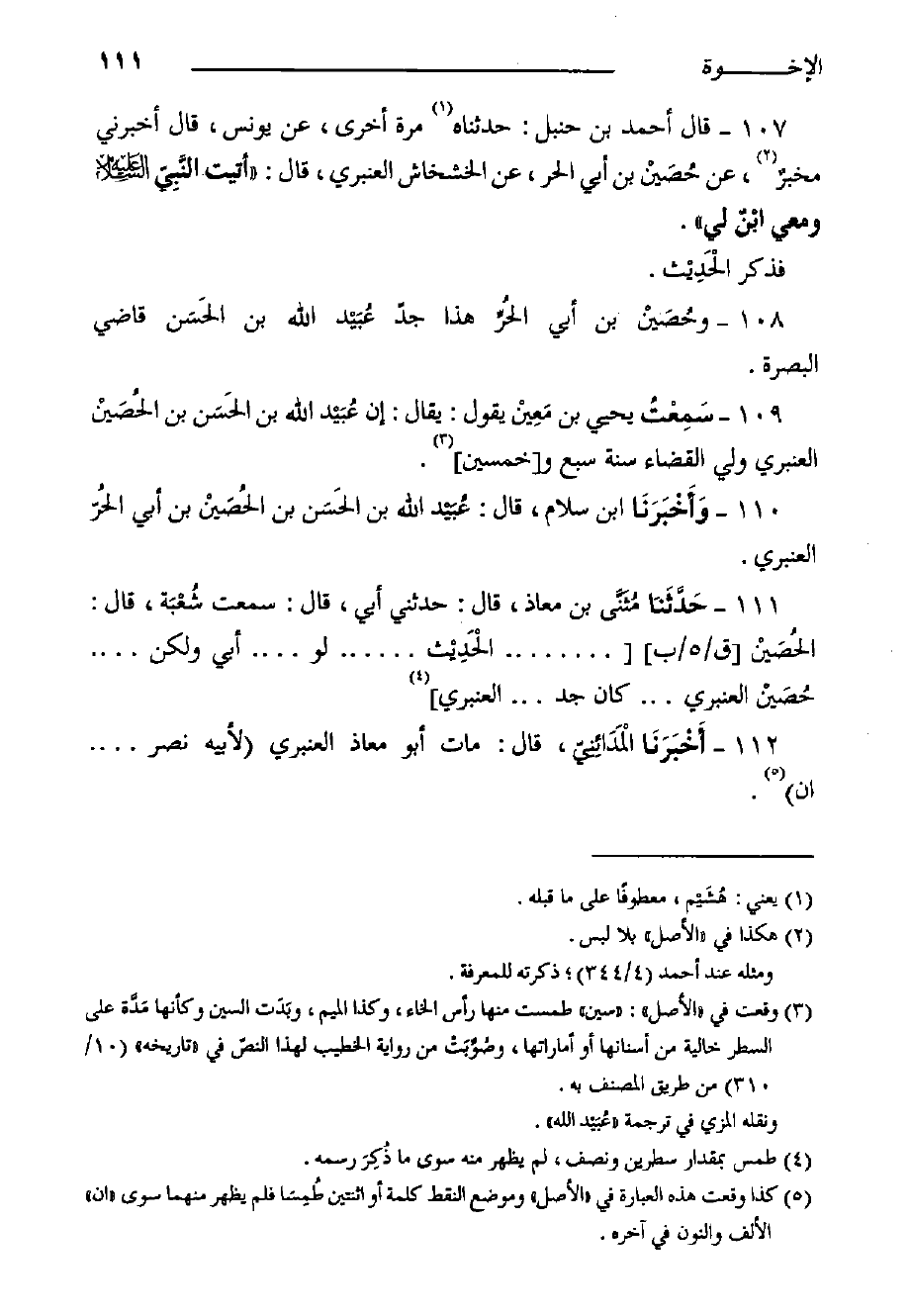 ١٠٦ - حَدَّثَنَا أَحْمَدُ بْنُ حنبل، قال: حدثنا هُشَيْم، قال: أخبرنا يُونُسُ بْنُ عُبَيْدٍ، عَنْ حُصَيْن أَبِي الْحُرِّ، عَنِ الْخَشْخَاشِ الْعَنْبَرِيِّ، قَالَ: أَتَيْتُ النَّبِيّ صَلَّى اللَّهُ عَلَيْهِ وَسَلَّمَ.