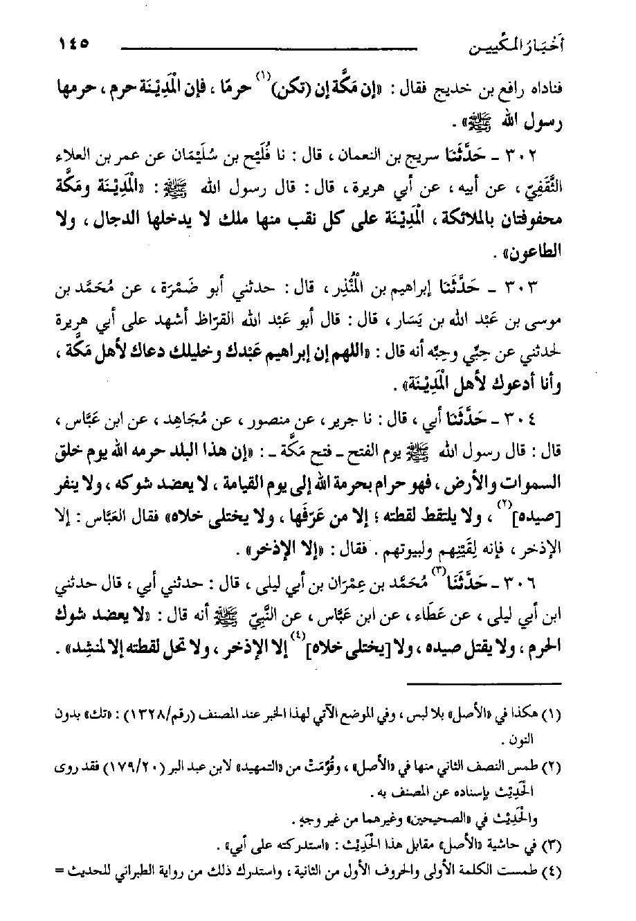 ٣٠١- حَدَّثَنا سُرَيْجُ بن النعمان، قال: حدثنا فُلَيْح بْنُ سُلَيْمَان، عَنْ عُتْبَة بْنِ مُسْلِم، عَنْ نَافِعِ بْنِ جُبَيْر، قَالَ: خَطَبَ مَرْوَان بْنُ الْحَكَم فذكر مَكَّة وحُرمَتَهَ