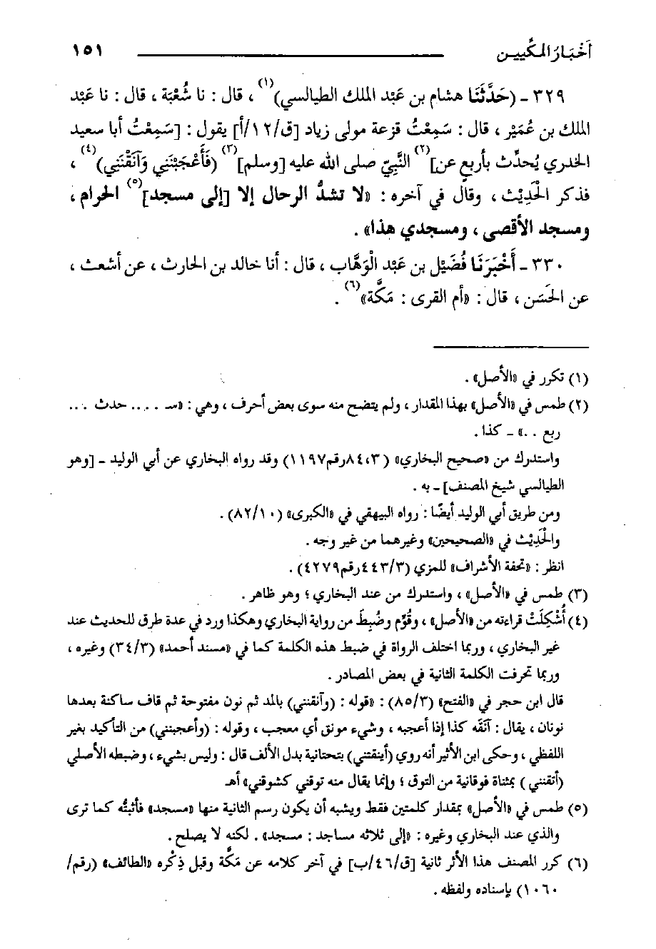 ٣٢٧- حَدَّثَنا سُرَيْجُ بن النعمان، قال: حدثنا فُلَيْح، عَنْ مُحَمَّد بْنِ عَبْد اللَّه بْنِ حُصَيْن، قَالَ: حَدَّثَنِي رَجُلٌ مِنْ قَوْمِي - كَانَ فِي الْجَيْشِ الَّذِينَ غَزَا بِهِمْ سَعْد الْقَادِسِيَّةَ - قَالَ: فَقُلْنَا: يَا أَمِيرَ الْمُؤْمِنِينَ رَأَيْنَا حِينَ قَفِلْنَا أَنْ نَأْتِيَ بَيْتَ الْمَقْدِسِ فَنُصَلِّي فِيهِ فَجَعَلَ يَضْرِبُ يَدَ الرَّجُلِ الَّذِي تَكَلَّمَ بِهَا بِشَيْءٍ فِي يَدِهِ، وَيَقُولُ: "وَيْحَكَ إِنَّ الأَبَاعِرَ لا تُرَحَّلُ إِلا إِلَى هَذَيْنِ الْمَسْجِدَيْنِِ مَسْجِدِ الْمَدِيْنَة وَمَسْجِدِ مَكَّة.
