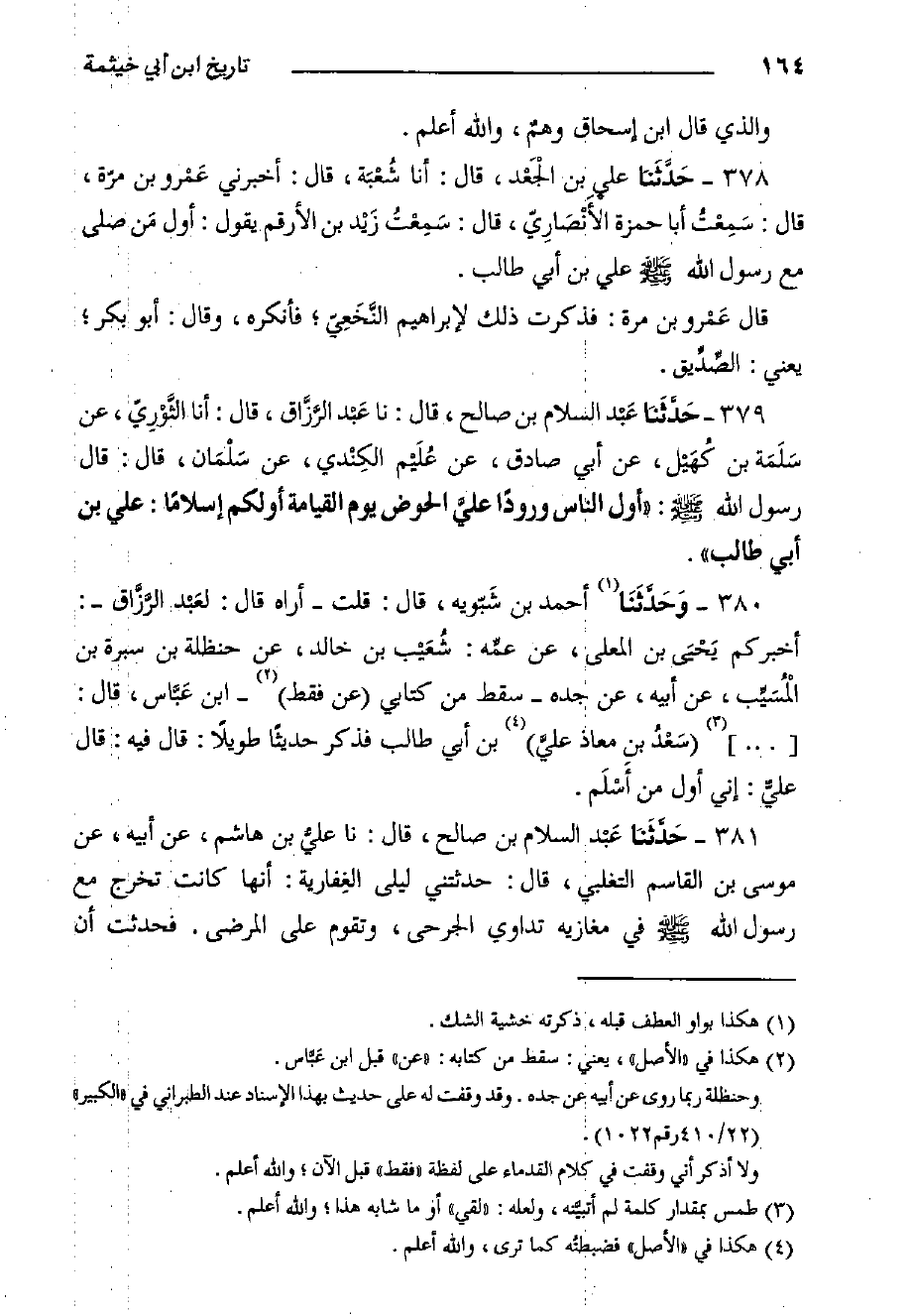٣٨٠ - وَحَدَّثَنَا أَحْمَد بْن شَبّويه، قَالَ: قلت - أراه قَالَ: لعَبْد الرَّزَّاق: أَخْبَرَكُمْ يَحْيَى بْن المعلى، عَنْ عمِّه: شُعَيْب بْن خالد، عَنْ حنظلة بْن سبرة بْن الْمُسَيَّب، عَنْ أَبِيهِ، عَنْ جده - سقط من كتابي عَنْ فقط - ابْن عَبَّاس، قَالَ: ... سَعْدُ بْن معاذ عليَّ بْن أبي طالب فذكر حديثًا طويلا: قَالَ فيه: قَالَ عليٌّ: إني أول من أَسْلَم.