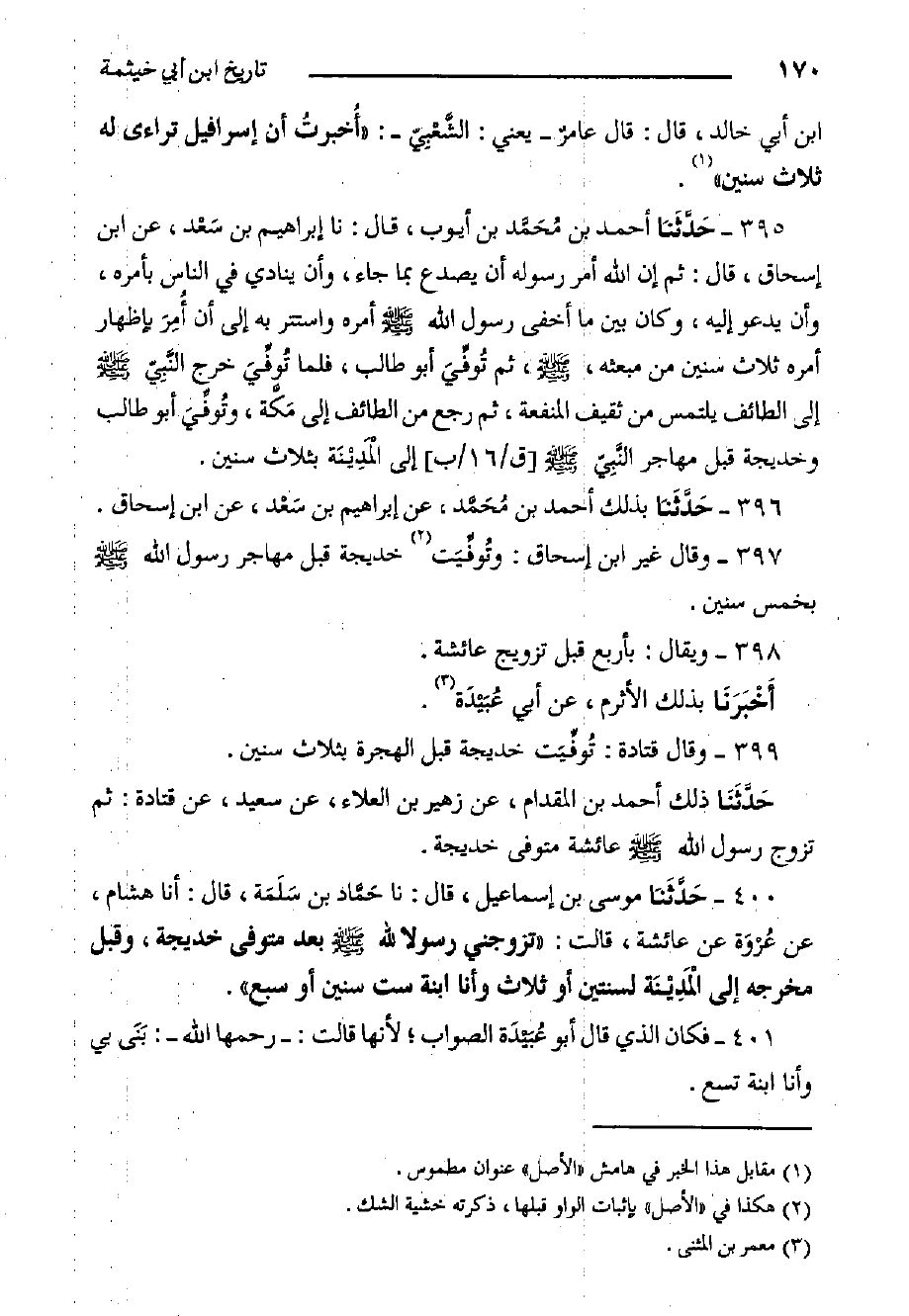 ٣٩٧ - وَقَالَ غير ابْن إِسْحَاقَ: وتُوفِّيَت خديجة قبل مهاجر رَسُول اللَّهِ صَلَّى اللَّهُ عَلَيْهِ وَسَلَّمَ بخمس سنين.