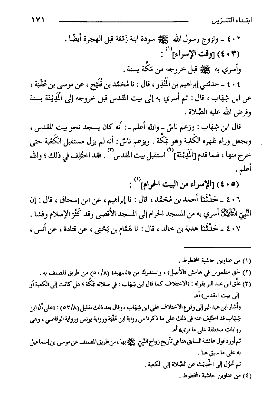 ٤٠٦- حَدَّثَنا أَحْمَدُ بْنُ مُحَمَّد، قال: حدثنا إِبْرَاهِيمُ، عَنِ ابْنِ إِسْحَاقَ، قَالَ: إِنَّ النَّبِيّ عَلَيْهِ السَّلامُ أُسْرِيَ بِهِ مِنَ الْمَسْجِدِ الْحَرَامِ إِلَى الْمَسْجِدِ الأَقْصَى وَقَدْ كَثُرَ الإِسْلامُ وَفَشَا.