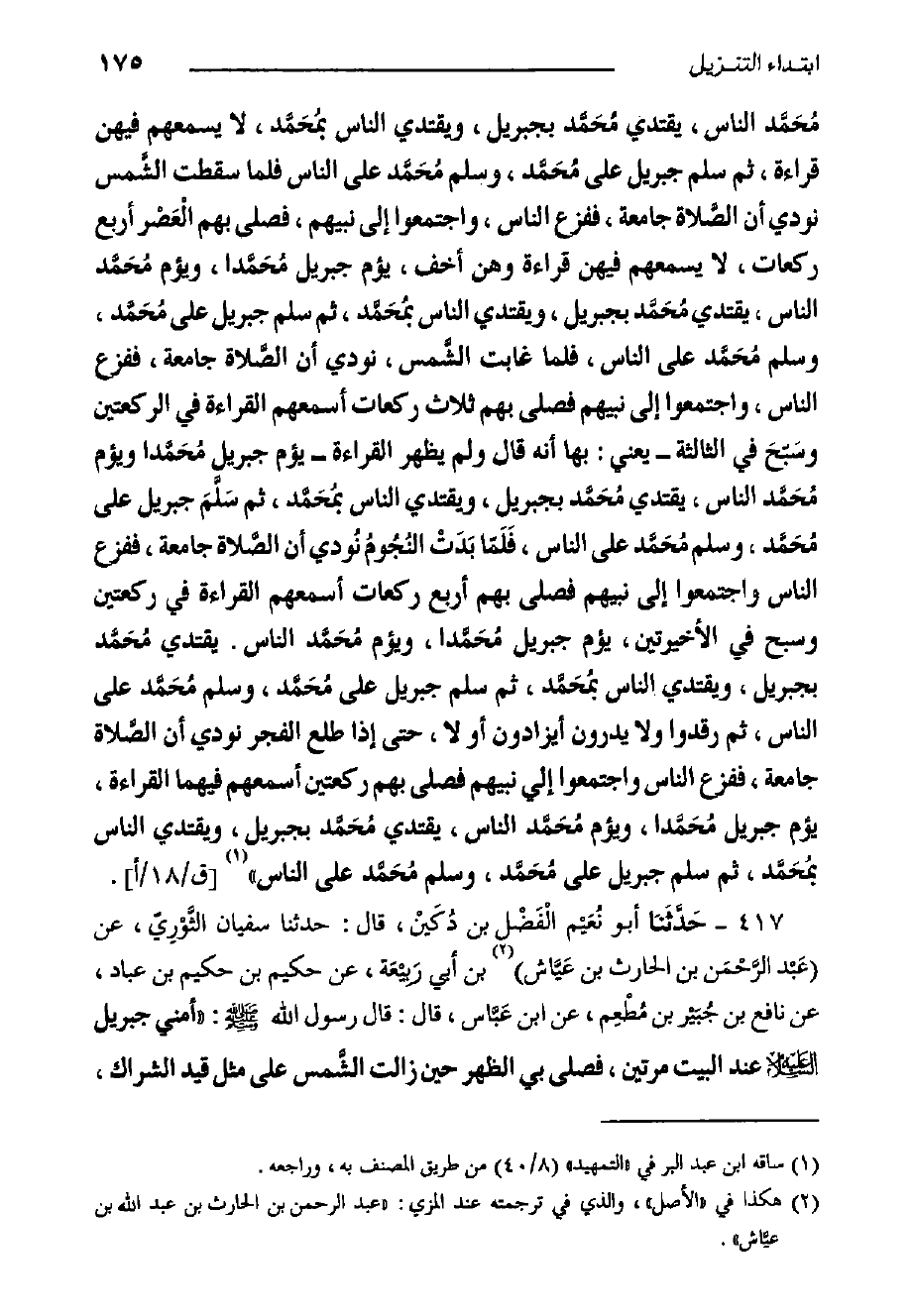 ٤١٧- حَدَّثَنا أبو نُعَيْم الْفَضْل بْن دُكَيْن، قَالَ: حَدَّثَنَا سُفْيَانُ الثَّوْرِيّ، عن عَبْد الرَّحْمَن بن الحارث بْنِ عَيَّاش بْنِ أَبِي رَبِيْعَة, عَنْ حكيم بْن حكيم بْن عَبَّادٍ, عَنْ نَافِعِ بْنِ جُبَيْر بْنِ مُطْعِم, عَنِ ابْنِ عَبَّاس، قَالَ: قَالَ رَسُولُ اللَّهِ صَلَّى اللَّهُ عَلَيْهِ وَسَلَّمَ: أَمَّنِي جِبْرِيلُ عَلَيْهِ السَّلامُ عِنْدَ الْبَيْتِ مَرَّتَيْنِ، فَصَلَّى بِي الظُّهْرَ حِينَ زَالَتِ الشَّمس عَلَى مِثْلِ قَيْدِ الشِّرَاكِ