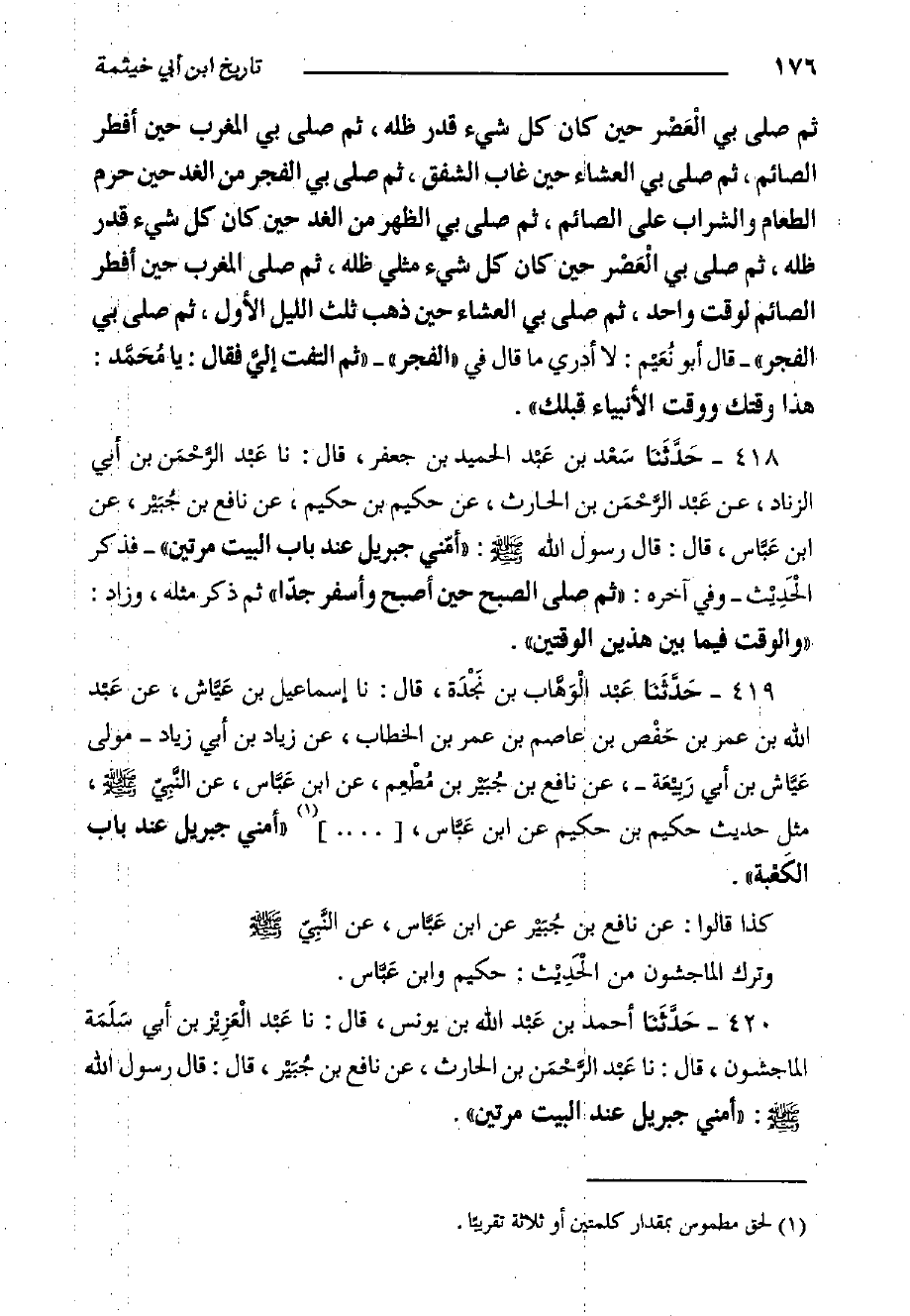٤١٩- حَدَّثَنا عَبْد الْوَهَّاب بْنُ نَجْدَة، قال: حَدَّثَنَا إِسْمَاعِيل بْن عَيَّاش، عَنْ عَبْد الله بن عمر بن حَفْص بن عاصم بن عمر بْنِ الْخَطَّابِ, عَنْ زِيَادِ بْنِ أَبِي زِيَادٍ - مَوْلَى عَيَّاش بْنِ أَبِي رَبِيْعَة، عَنْ نَافِعِ بْنِ جُبَيْر بْنِ مُطْعِم، عَنِ ابْنِ عَبَّاس، عَنِ النَّبِيّ صَلَّى اللَّهُ عَلَيْهِ وَسَلَّمَ، مِثْلَ حَدِيثِ حَكِيمِ بْنِ حَكِيمٍ عَنِ ابْنِ عَبَّاس، ... "أَمَّنِي جِبْرِيلُ عِنْدَ بَابِ الكَعْبة.