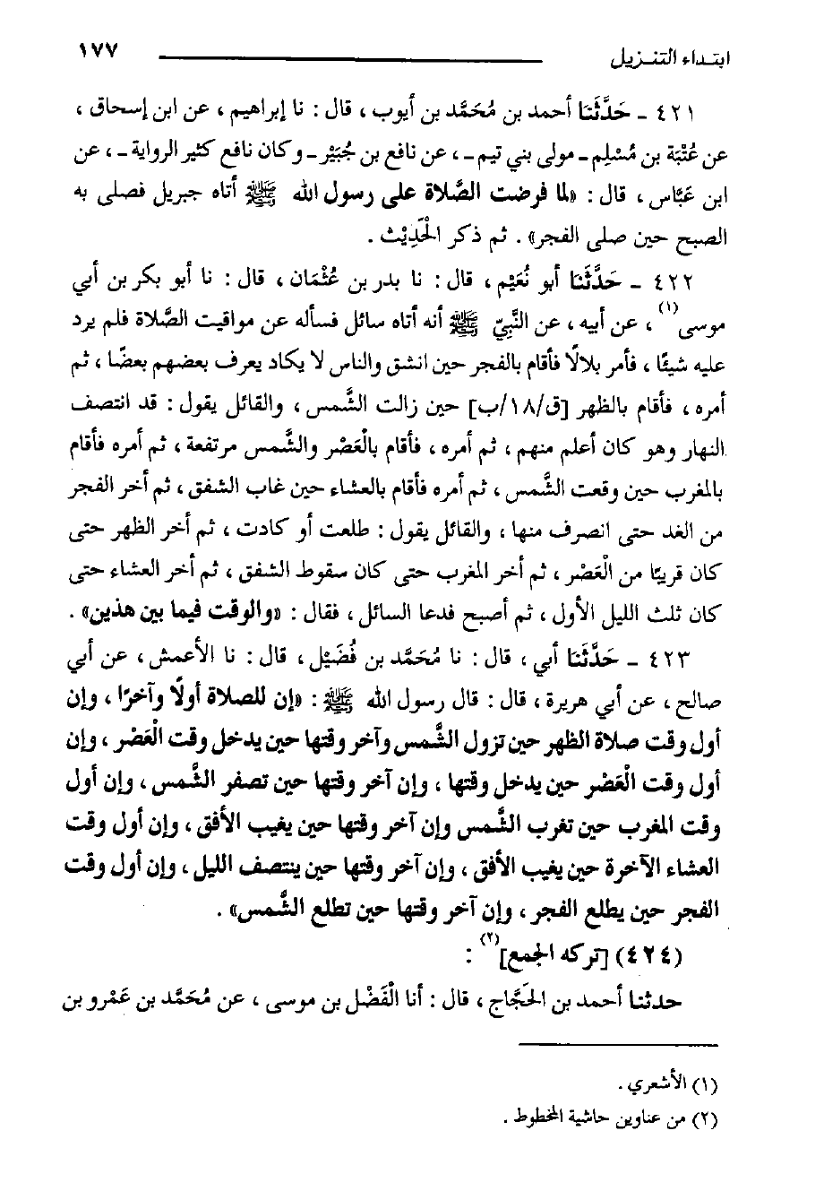 ٤٢١- حَدَّثَنا أَحْمَدُ بْنُ مُحَمَّد بْنِ أيوب، قال: حدثنا إِبْرَاهِيمُ، عَنِ ابْنِ إِسْحَاقَ، عَنْ عُتْبَة بْنِ مُسْلِم - مَوْلَى بَنِي تيم، عن نافع بن جُبَيْر - وَكَانَ نَافِعٌ كَثِيرُ الرِّوَايَةِ، عَنِ ابْنِ عَبَّاس، قَالَ: لَمَّا فُرِضَتِ الصَّلاة عَلَى رَسُولِ اللَّهِ صَلَّى اللَّهُ عَلَيْهِ وَسَلَّمَ أَتَاهُ جِبْرِيلُ فَصَلَّى بِهِ الصُّبْحَ حِينَ صَلَّى الْفَجْرَ. ثُمَّ ذَكَرَ الْحَدِيْث.