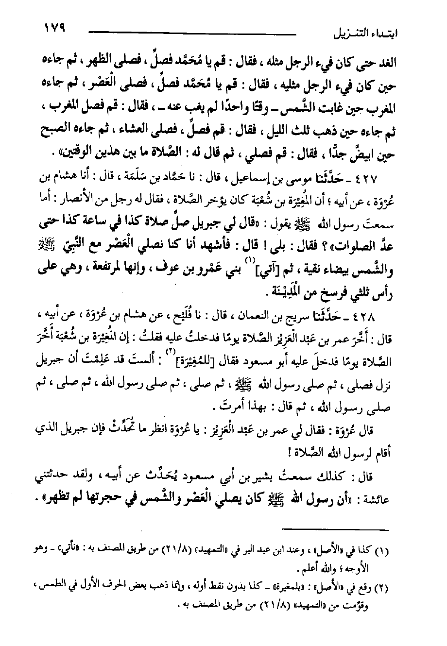 ٤٢٧- حَدَّثَنا مُوسَى بن إسماعيل، قال: حدثنا حَمَّاد بن سَلَمَة، قال: أخبرنا هِشَامُ بْنُ عُرْوَة، عَنْ أَبِيهِ؛ أَنَّ المُغِيْرَة بْنَ شُعْبَة كَانَ يُؤَخِّرُ الصَّلاة، فَقَالَ لَهُ رَجُلٌ مِنَ الأَنْصَارِ: أَمَا سمعتَ رَسُولَ اللَّهِ صَلَّى اللَّهُ عَلَيْهِ وَسَلَّمَ يَقُولُ: "قَالَ لِي جِبْرِيلُ صلِّ صَلاةَ كَذَا فِي سَاعَةِ كَذَا حَتَّى عدَّ الصَّلَوَاتِ"؟ فَقَالَ: بَلَى! قَالَ: فَأَشْهَدُ أَنَّا كُنَّا نُصَلِّي الْعَصْر مَعَ النَّبِيّ صَلَّى اللَّهُ عَلَيْهِ وَسَلَّمَ والشَّمس بَيْضَاءُ نَقِيَّةٌ، ثُمَّ أَتَى بَنِي عَمْرو بْنِ عَوْفٍ، وَإِنَّهَا لَمُرْتَفِعَةٌ، وَهِيَ عَلَى رَأْسِ ثُلَثَيْ فَرْسَخٍ مِنَ الْمَدِيْنَة.