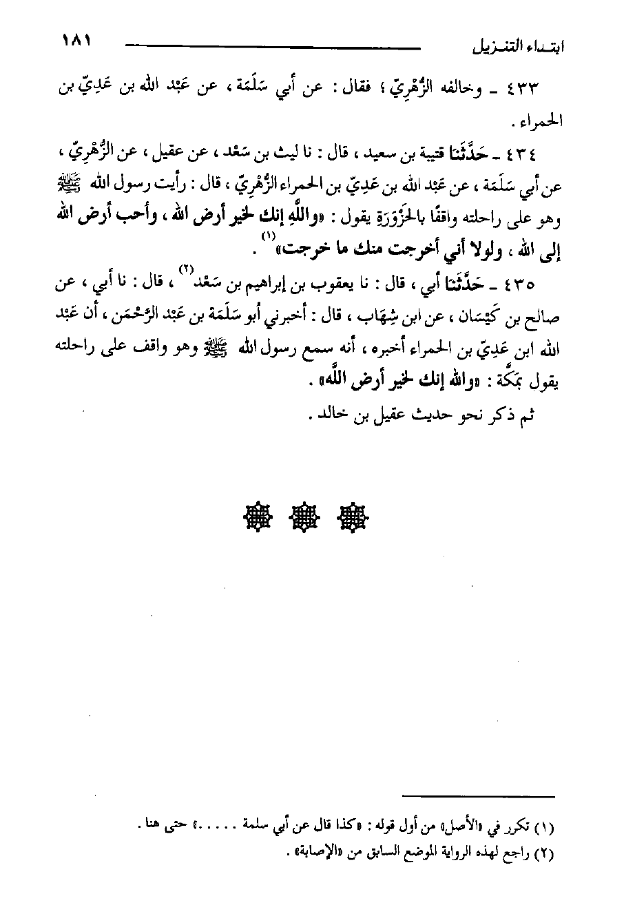٤٣٥- حَدَّثَنا أَبِي، قال: حدثنا يَعْقُوبُ بْنُ إِبْرَاهِيمَ بْنِ سَعْد، قال: حدثنا أَبِي، عَنْ صَالِحِ بْنِ كَيْسَان، عَنِ ابْنِ شِهَاب، قَالَ: أَخْبَرَنِي أَبُو سَلَمَة بْنُ عَبْد الرَّحْمَن، أن عَبْد الله ابن عَدِيّ بْنِ الْحَمْرَاءِ أَخْبَرَهُ، أَنَّهُ سَمِعَ رَسُولَ اللَّهِ صَلَّى اللَّهُ عَلَيْهِ وَسَلَّمَ وَهُوَ وَاقِفٌ عَلَى رَاحِلَتِهِ يَقُولُ بمَكَّة: "واللَّه إِنَّكِ لَخَيْرُ أَرْضِ اللَّه، ثُمَّ ذَكَرَ نَحْوَ حَدِيثِ عُقَيْلِ بْنِ خَالِدٍ