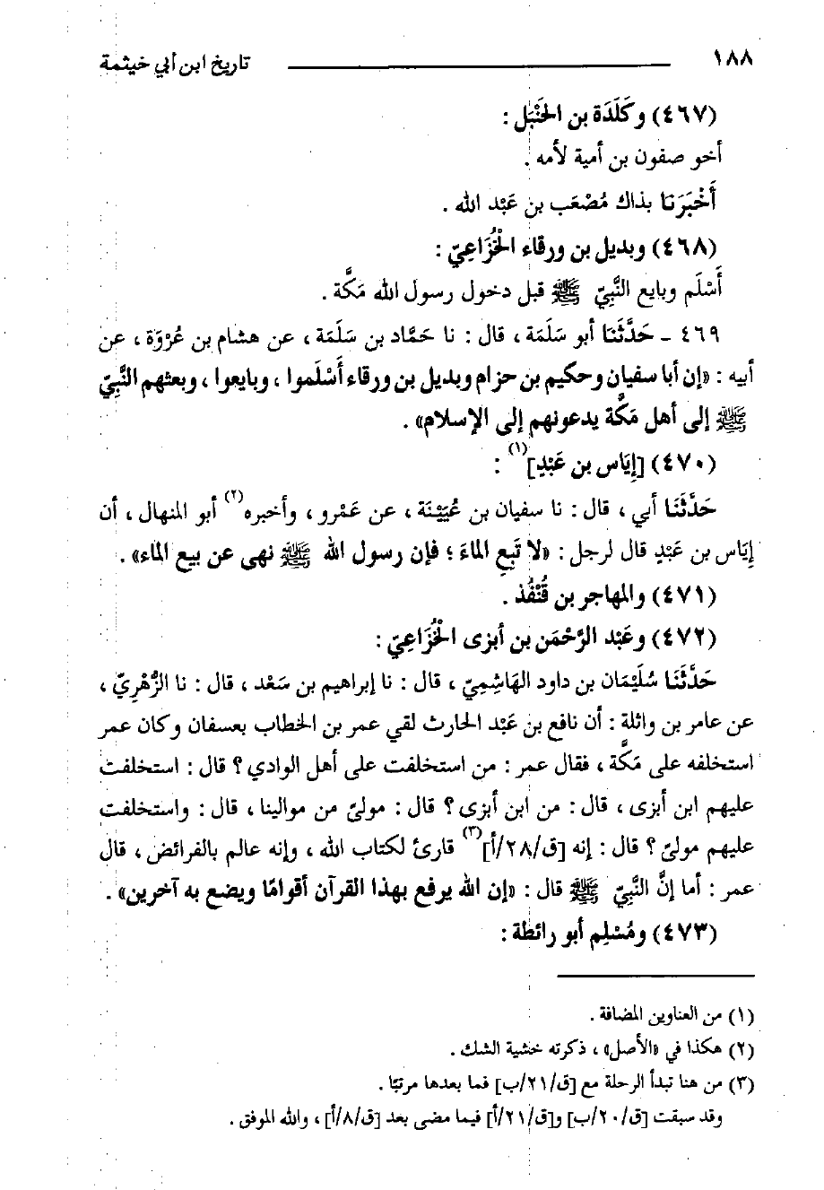 ٤٦٩- حَدَّثَنا أبو سَلَمَة، قال: حدثنا حَمَّاد بْنُ سَلَمَة، عَنْ هِشَامِ بْنُ عُرْوَة, عَنْ أَبِيهِ: "أَنَّ أَبَا سُفْيَانَ وَحَكِيمَ بْنَ حِزَامٍ وَبَدِيلَ بْنَ وَرْقَاءَ أَسْلَموا, وَبَايَعُوا, وَبَعَثَهُمُ النَّبِيّ صَلَّى اللَّهُ عَلَيْهِ وَسَلَّمَ إِلَى أَهْلِ مَكَّة يَدْعُونَهُمْ إِلَى الإِسْلامِ.