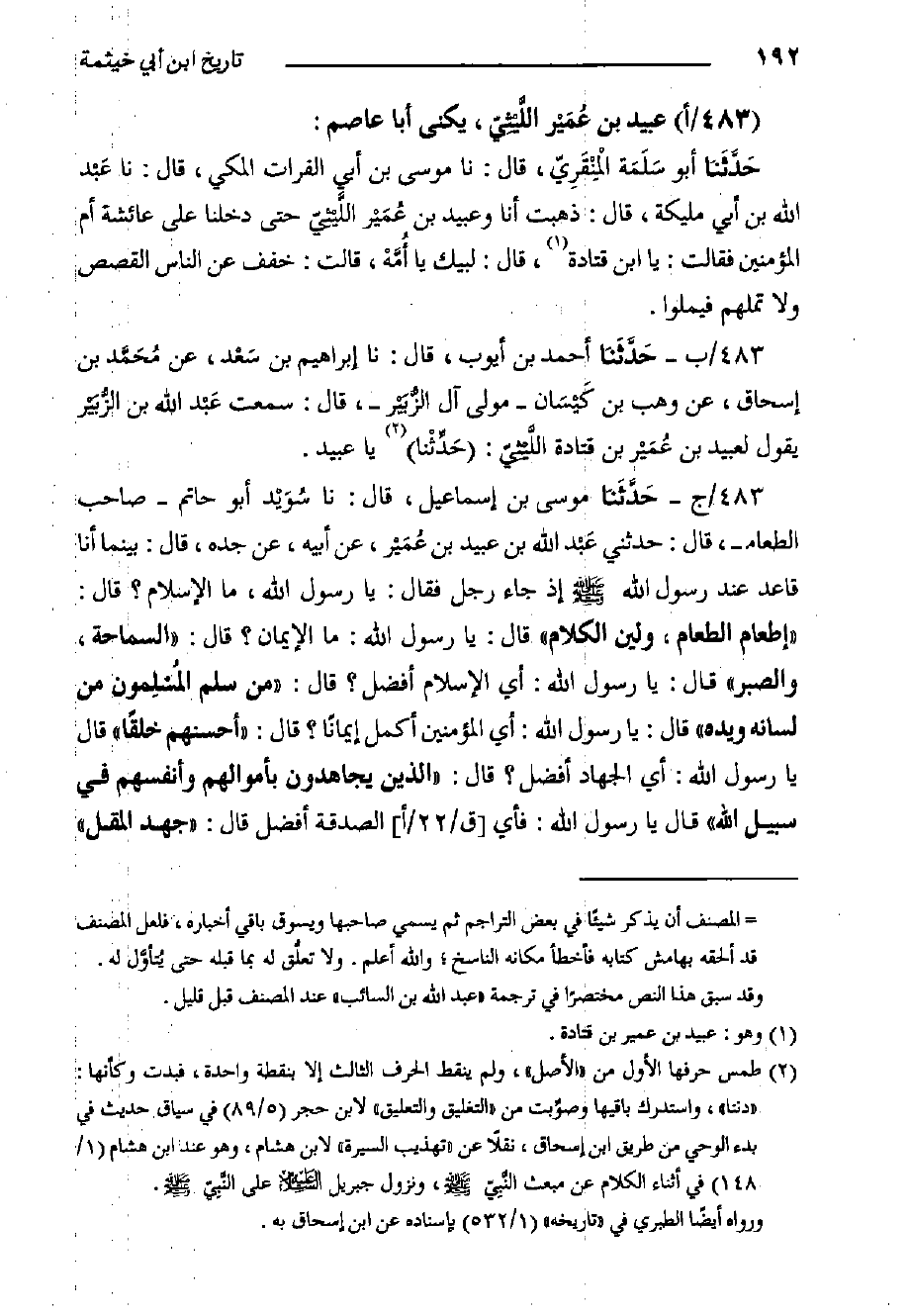٤٨٣/ج- حَدَّثَنا مُوسَى بْن إِسْمَاعِيلَ، قَالَ: حدثنا سُوَيْد أَبُو حَاتِمٍ - صَاحِبُ الطَّعَامِ، قَالَ: حَدَّثَنِي عَبْد اللَّهِ بْن عُبَيْدِ بْنِ عُمَيْر، عَنْ أَبِيهِ، عَنْ جَدِّهِ، قَالَ: بَيْنَمَا أَنَا قَاعِدٌ عِنْدَ رَسُولِ اللَّهِ صَلَّى الله عليه وسلم إذ جَاءَ رَجُلٌ فَقَالَ: يَا رَسُولَ اللَّهِ، مَا الإِسْلامُ؟ قَالَ: إِطْعَامُ الطَّعَامِ، وَلِينُ الْكَلامِ" قَالَ: يَا رَسُولَ اللَّهِ: مَا الإِيمَانُ؟ قَالَ: السَّمَاحَةُ، وَالصَّبْرُ" قَالَ: يَا رَسُولَ اللَّهِ: أَيُّ الإِسْلامِ أَفْضَلُ؟ قَالَ: مَنْ سَلِمَ المُسْلِمون مِنْ لِسَانِهِ وَيَدِهِ" قَالَ: يَا رَسُولَ اللَّهِ: أَيُّ الْمُؤْمِنِينَ أَكْمَلُ إِيمَانًا؟ قَالَ: أَحْسَنُهُمْ خُلُقًا" قَالَ يَا رَسُولَ اللَّهِ: أَيُّ الْجِهَادِ أَفْضَلُ؟ قَالَ: الَّذِينَ يُجَاهِدُونَ بِأَمْوَالِهِمْ وَأَنْفُسِهِمْ فِي سَبِيلِ اللَّه" قَالَ يَا رَسُولَ الله: فأي [ق/٢٢/أ] الصَّدَقَةِ أَفْضَلُ قَالَ: جُهْدُ الْمُقِلِّ"