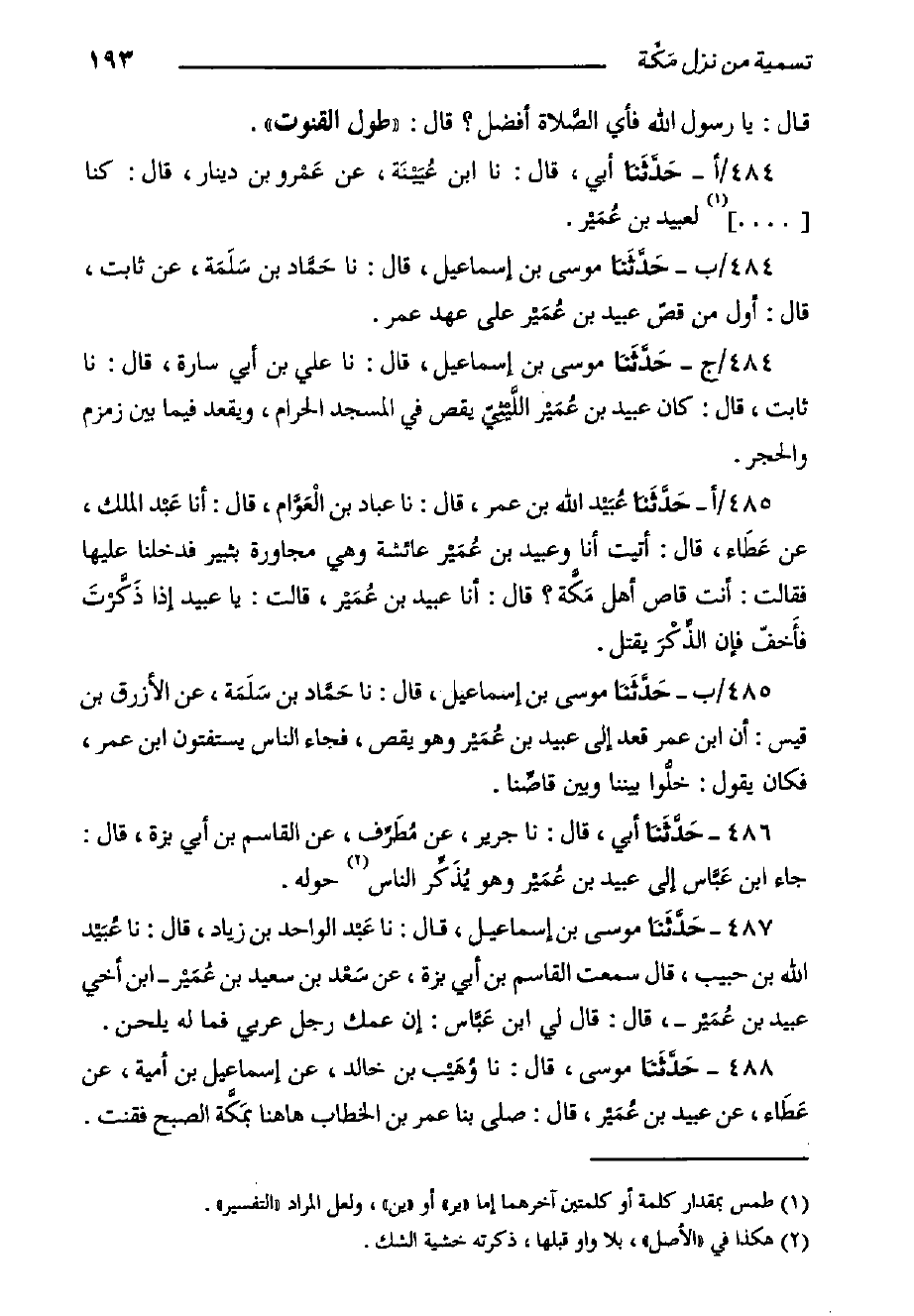 ٤٨٤/ج- حَدَّثَنا مُوسَى بْن إِسْمَاعِيلَ، قَالَ: حدثنا عَلِيّ بْن أبي سارة، قَالَ: حدثنا ثابت، قَالَ: كَانَ عبيد بْن عُمَيْر اللَّيْثِيّ يقص فِي الْمَسْجِد الحرام، ويقعد فيما بين زمزم والحجر.
