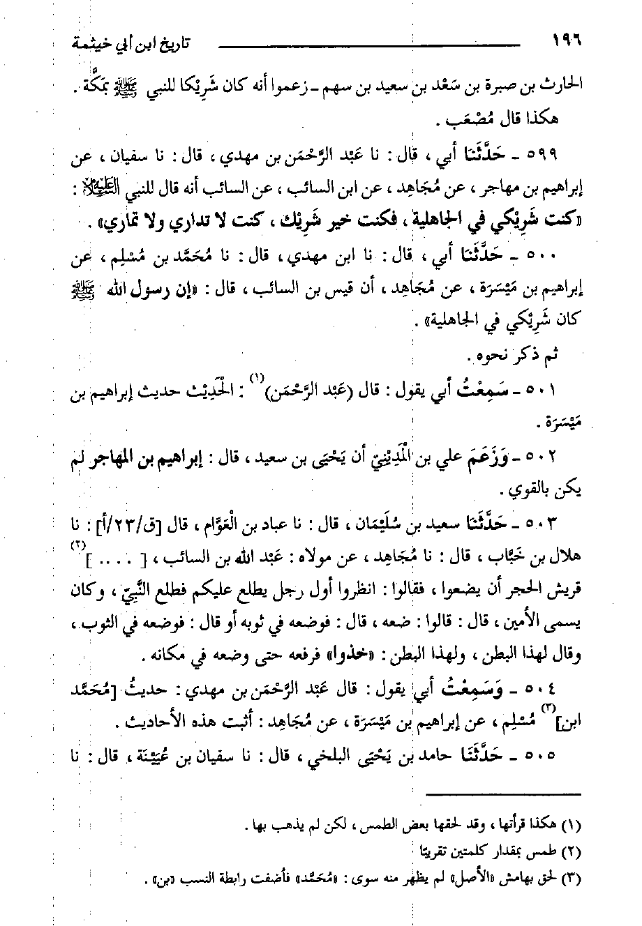 ٤٩٩- حَدَّثَنا أَبِي، قَالَ: حدثنا عَبْد الرَّحْمَن بْنُ مَهْدِيٍّ، قَالَ: حدثنا سُفْيَانُ، عَنْ إِبْرَاهِيمَ بْنِ مُهَاجِرٍ، عَنْ مُجَاهِد، عَنِ ابْنِ السَّائِبِ، عَنِ السَّائِبِ أَنَّهُ قَالَ لِلنَّبِيِّ عليه السلام: "كُنْتَ شَرِيْكي فِي الْجَاهِلِيَّةِ، فَكُنْتَ خَيْرَ شَرِيْك, كُنْتَ لا تُدَارِي وَلا تُمَارِي.