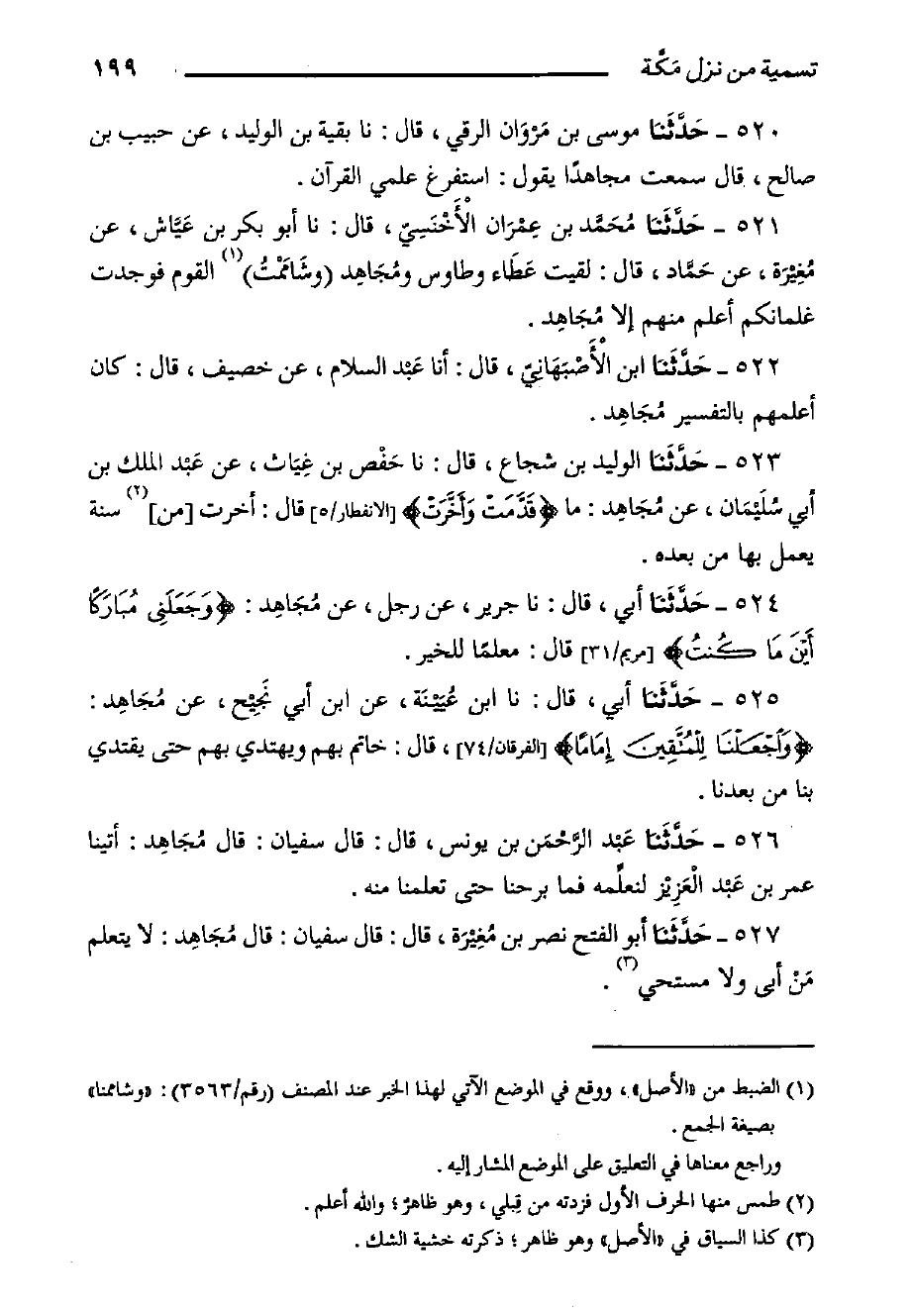 ٥٢٢- حَدَّثَنا ابن الأَصْبَهَانِيّ، قال: أخبرنا عَبْد السَّلامِ، عَنْ خصيف، قَالَ: كَانَ أعلمهم بالتفسير مُجَاهِد.