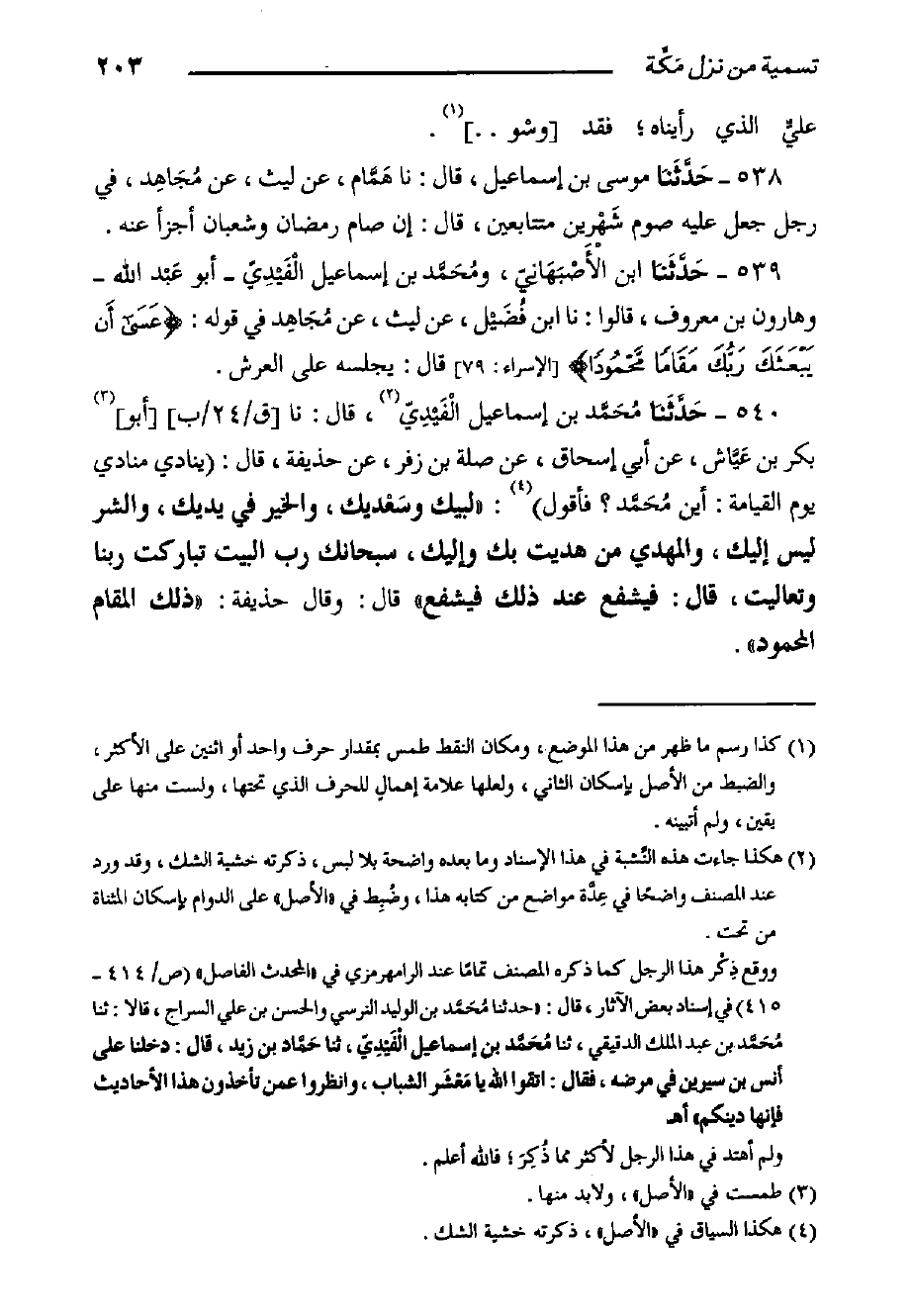 ٥٤٠- حَدَّثَنا مُحَمَّد بْنُ إِسْمَاعِيلَ الْفَيْدِيّ، قَالَ: حدثنا [ق/٢٤/ب] أَبُو بَكْرِ بْنُ عَيَّاش، عَنْ أَبِي إِسْحَاقَ، عَنْ صِلَةَ بْنِ زُفَرَ، عَنْ حُذَيْفَةَ، قَالَ: يُنَادِي منادي يَوْمَ الْقِيَامَةِ: أَيْنَ مُحَمَّد؟ فَأَقُولُ: "لَبَّيْكَ وسَعْديك، وَالْخَيْرُ فِي يَدَيْكَ، وَالشَّرُّ لَيْسَ إِلَيْكَ، وَالْمَهْدِيُّ مِنْ هَدَيْتَ بِكَ وَإِلَيْكَ، سُبْحَانَكَ رَبِّ الْبَيْتِ تَبَارَكْتَ رَبَّنَا وَتَعَالَيْتَ، قَالَ: فَيَشْفَعْ عِنْدَ ذَلِكَ فَيُشَفَّعْ" قَالَ: وَقَالَ حُذَيْفَة: "ذَلِكَ الْمَقَامُ الْمَحْمُودُ