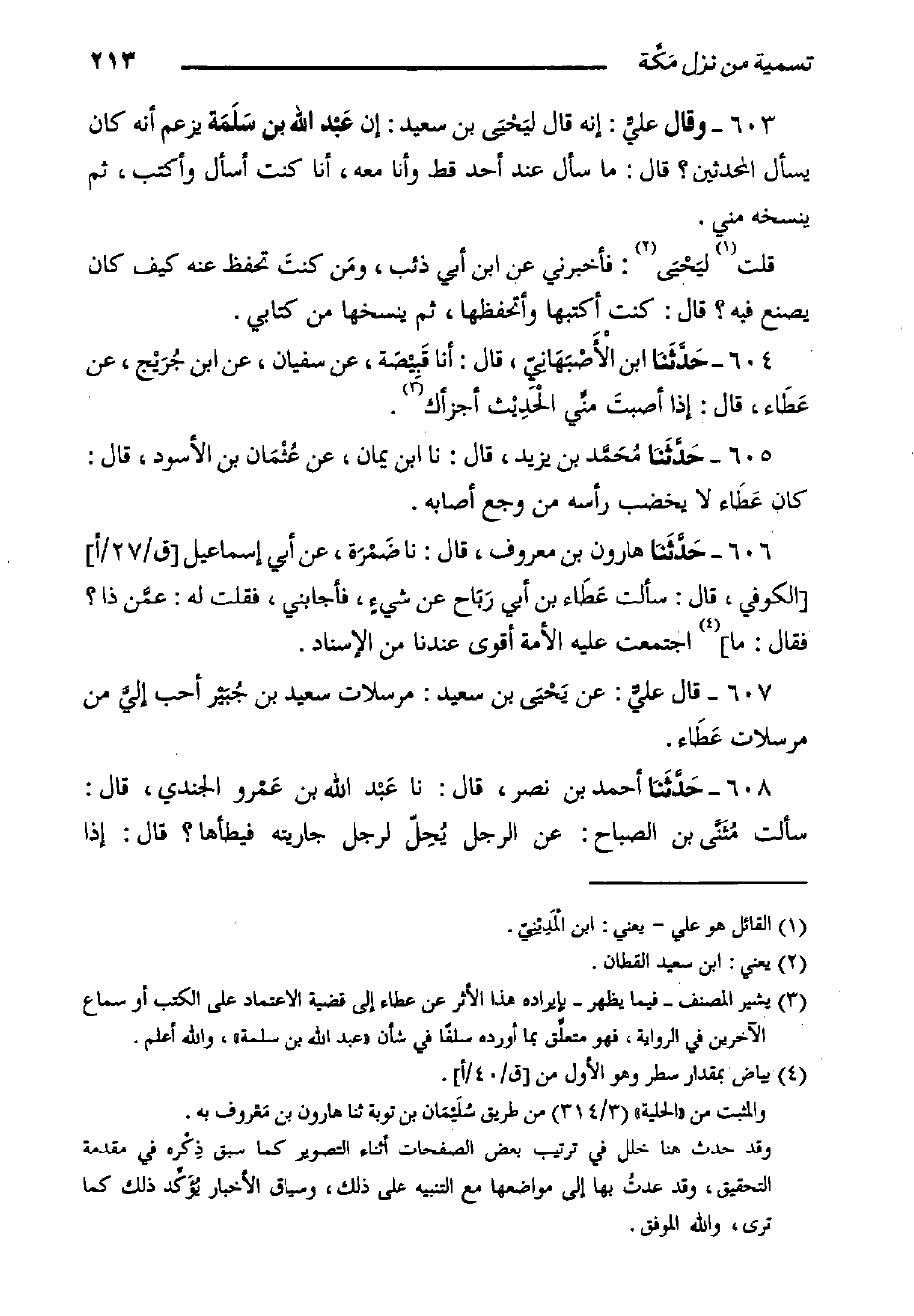 ٦٠٣ - وَقَالَ عليٌّ: إِنَّهُ قَالَ ليَحْيَى بْن سَعِيدٍ: إن عَبْد اللَّهِ بْن سَلَمَة يزعم أَنَّهُ كَانَ يسأل المحدثين؟ قَالَ: ما سأل عند أحد قط وأنا معه، أنا كنت أسأل وأكتب، ثُمَّ ينسخه مني.