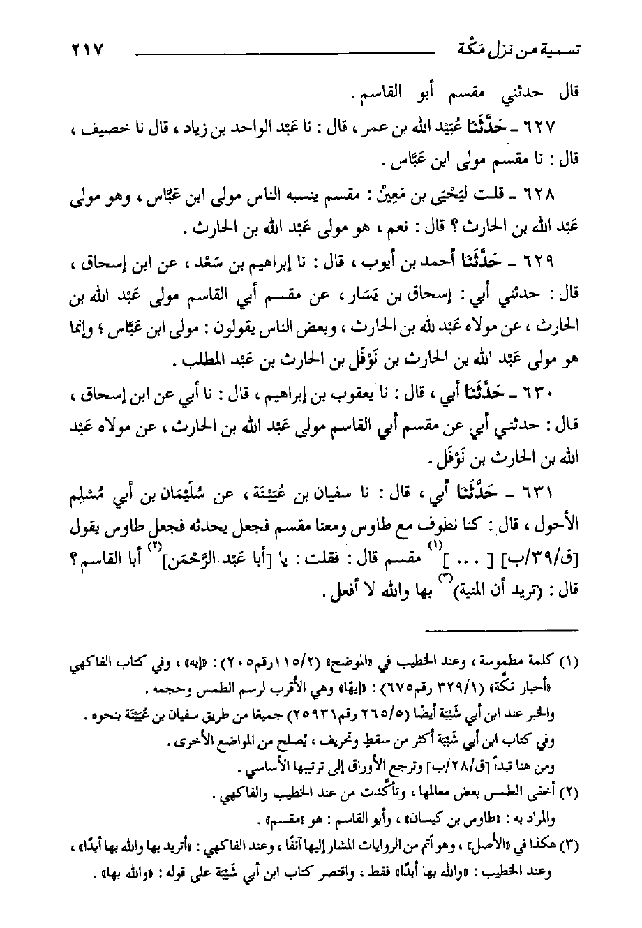 ٦٣١- حَدَّثَنا أبي، قال: حدثنا سُفْيَانُ بْنُ عُيَيْنَة، عَنْ سُلَيْمَان بْن أبي مُسْلِم الأحول، قَالَ: كنا نطوف مع طاووس ومعنا مقسم فجعل يحدثه فجعل طاووس يقول [ق/٣٩/ب] ... مقسم قَالَ: فقلت: يَا أبا عَبْد الرَّحْمَن أبا القاسم؟ قَالَ: تريد أن المنية بها والله لا أفعل