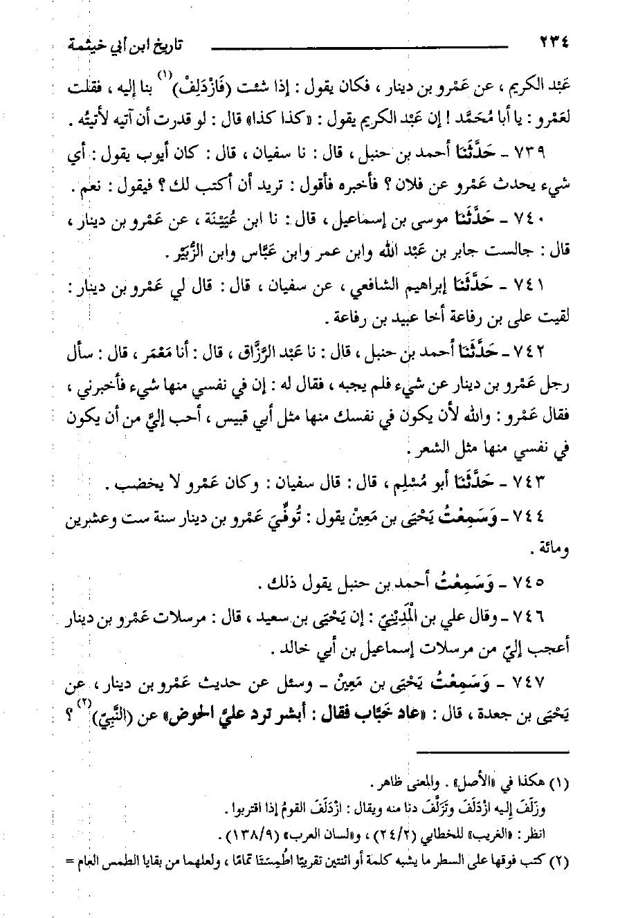 ٧٤٤ - وَسَمِعْتُ يَحْيَى بْن مَعِيْن يَقُولُ: تُوفِّيَ عَمْرو بْن دينار سنة ست وعشرين ومئة.