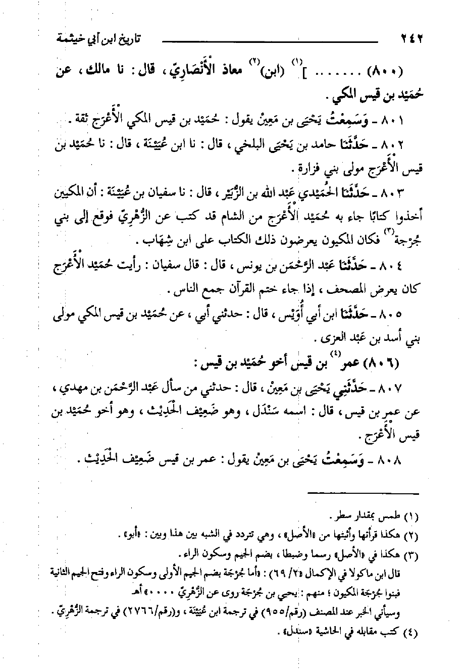 ٨٠٢- حَدَّثَنا حامد بْن يَحْيَى البلخي, قال: حدثنا ابن عُيَيْنَة، قال: حدثنا حُمَيْد بْن قيس الأَعْرَج مولى بني فزارة.
