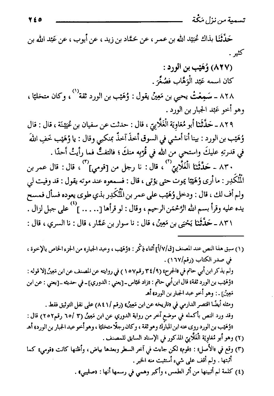 ٨٢٨- سَمِعْتُ يَحْيَى بْن مَعِيْن يَقُولُ: وُهَيْب بْن الورد ثقة، وكان متخليًا، وهو أخو عَبْد الجبار بْن الورد.