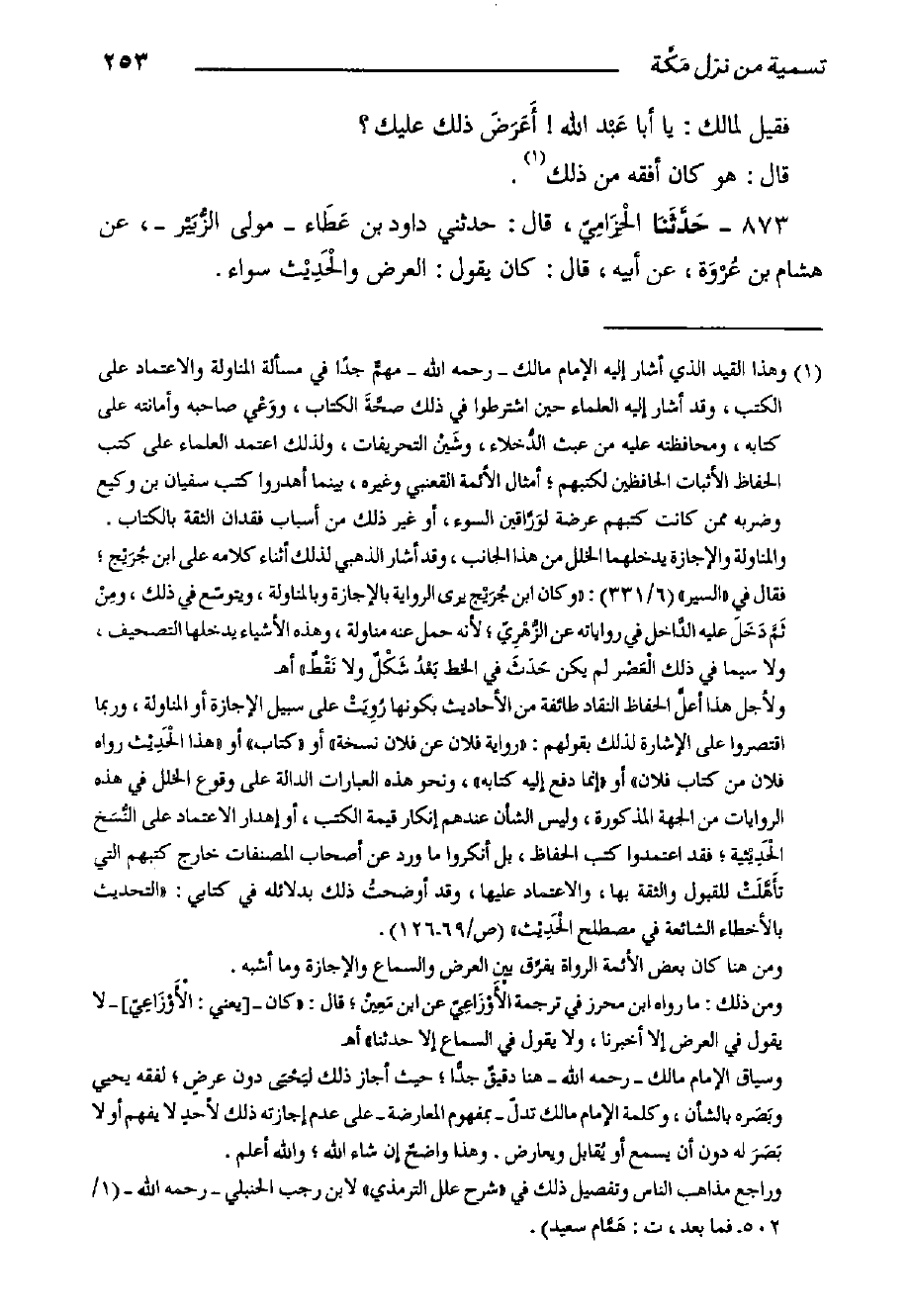 ٨٧٣- حَدَّثَنا الْحِزَامِيّ، قَالَ: حَدَّثَنِي دَاوُد بْن عَطَاء - مولى الزُّبَيْر، عَنْ هِشَامُ بْنُ عُرْوَة، عَنْ أَبِيهِ, قَالَ: كَانَ يَقُولُ: العرض والْحَدِيْث سواء
