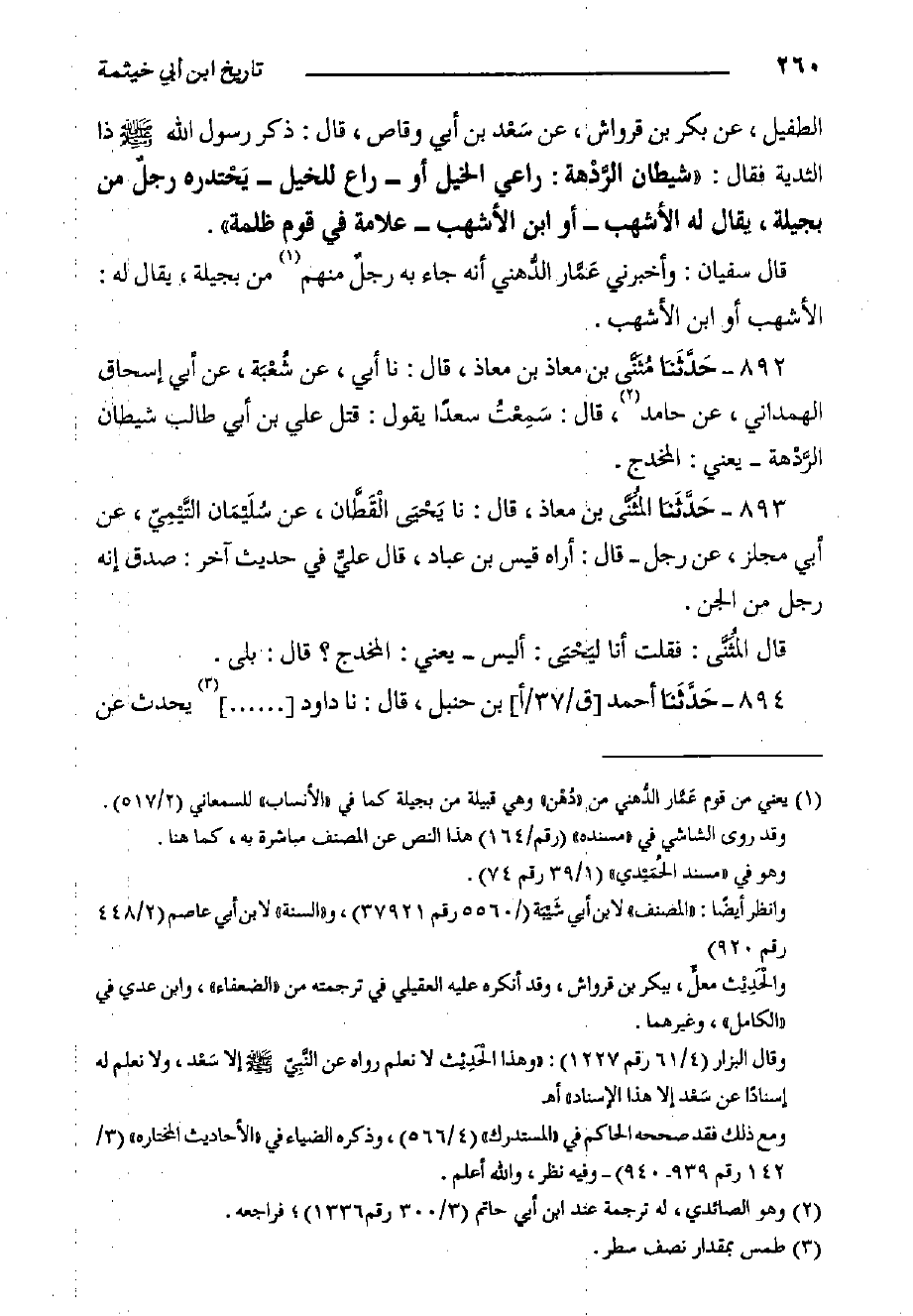 ٨٩٢- حَدَّثَنا مُثَنَّى بْن معاذ بْن معاذ، قَالَ: حدثنا أَبِي، عَنْ شُعْبَة، عَنْ أَبِي إِسْحَاقَ الْهَمْدَانِيِّ، عَنْ حَامِدٍ , قَالَ: سَمِعْتُ سَعْدًا يَقُولُ: قَتَلَ عَلِيُّ بْنُ أَبِي طَالِبٍ شَيْطَانَ الرَّدْهة - يَعْنِي: الْمُخْدَجَ.